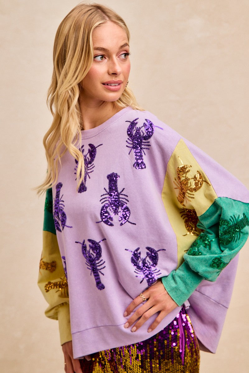 Sequin Crawfish Embroideries Washed Mardi Gras Color Block Oversized Sweatshirt Top100%Cotton