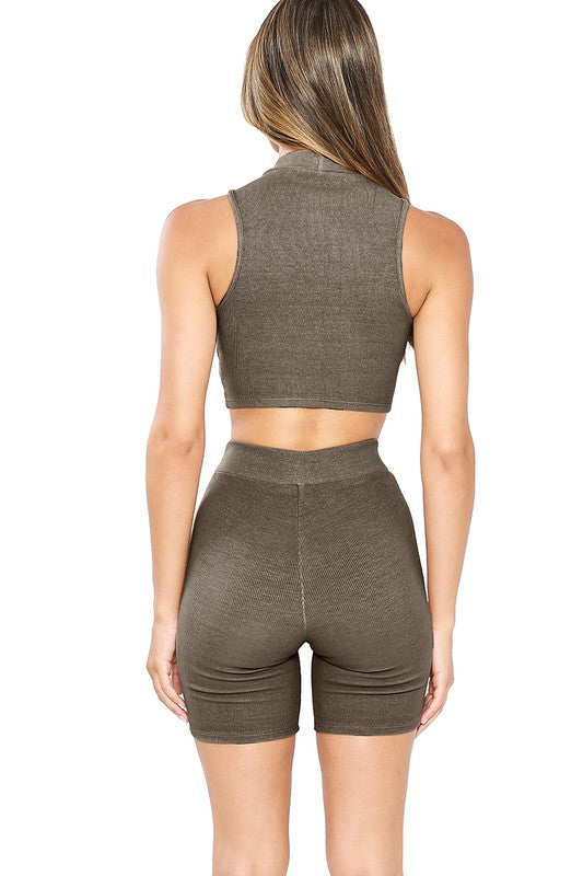 Pigment-dyed 2x1mock Neck Sleeveless Cropped Top With Biker Shorts Set