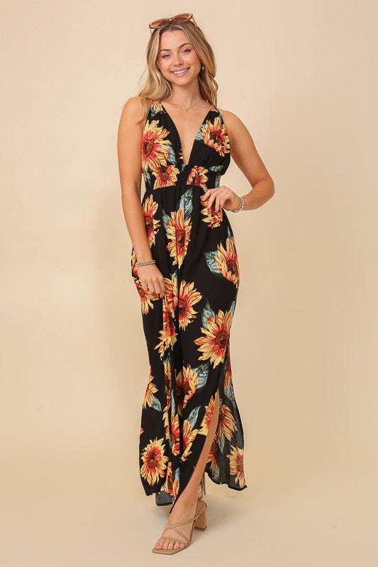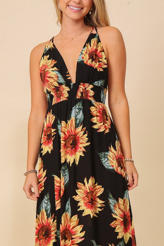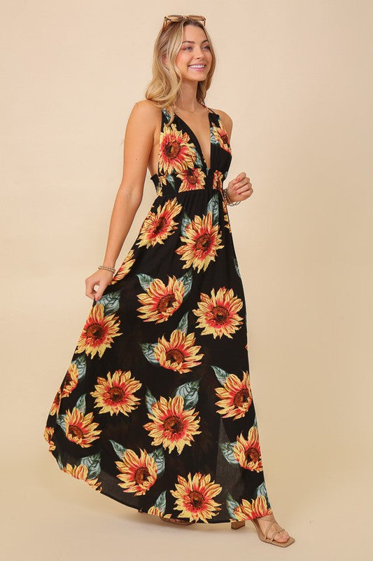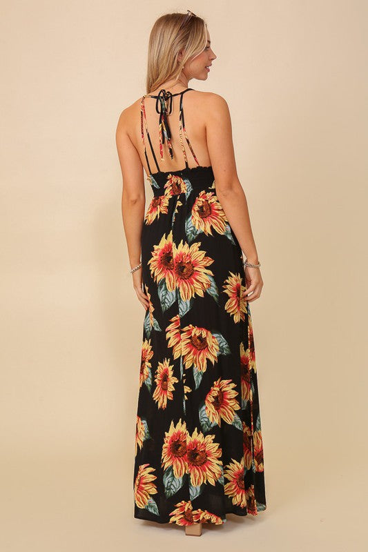 Behold The Floral Finery Of A Sleeveless Halter Maxi, Flecked With Happy Sunflowers And Graced With A Daring Side Slit! And What Of That Sultry Open Back, You Ask? Fear Not, Dear Friend, For It Is Adorned With A Self-Tie Detail, Allowing You To Show Only As Much Skin As You Please. Let This Dress Breathe Life Into Your Wardrobe And Bring A Smile To Your Face With Its Cheerful Motif.