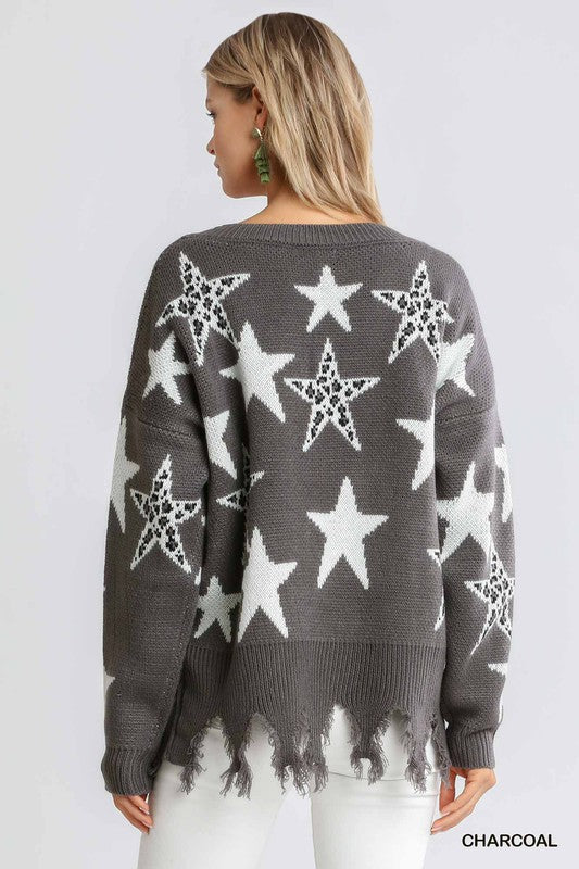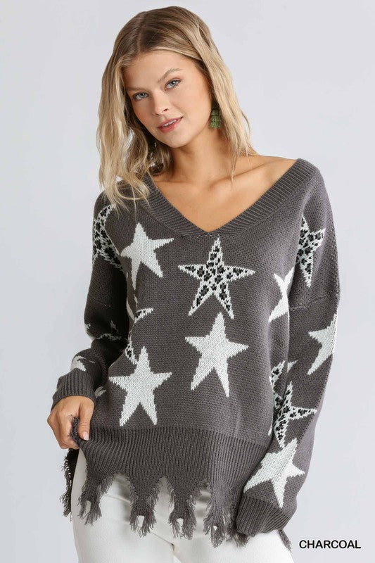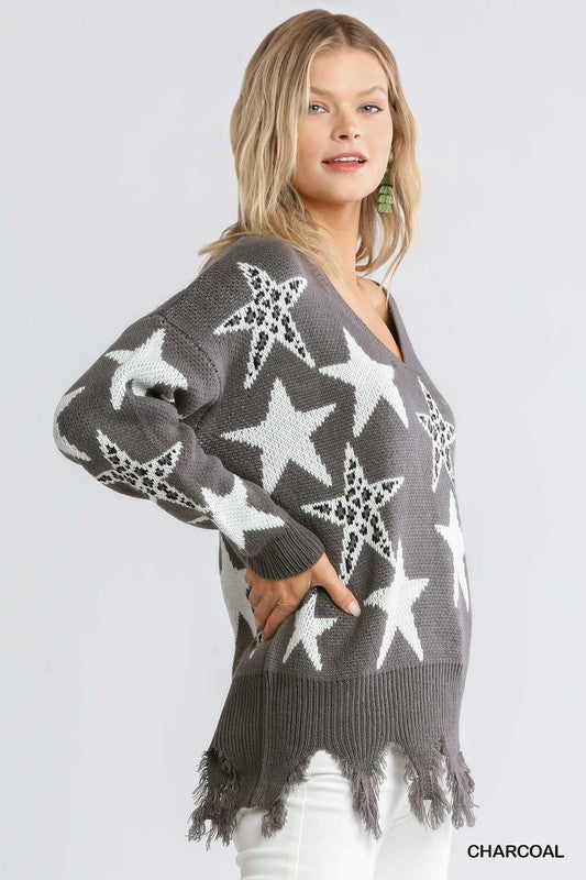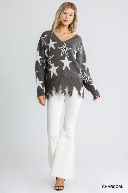 Animal Star Print V-Neck Long Sleeve Sweater With Distressed HemFabric Contents100%Acrylic