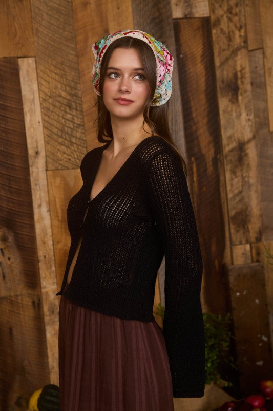 Black Bell Sleeve Front Button Crochet Knit Cardigan