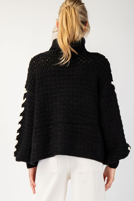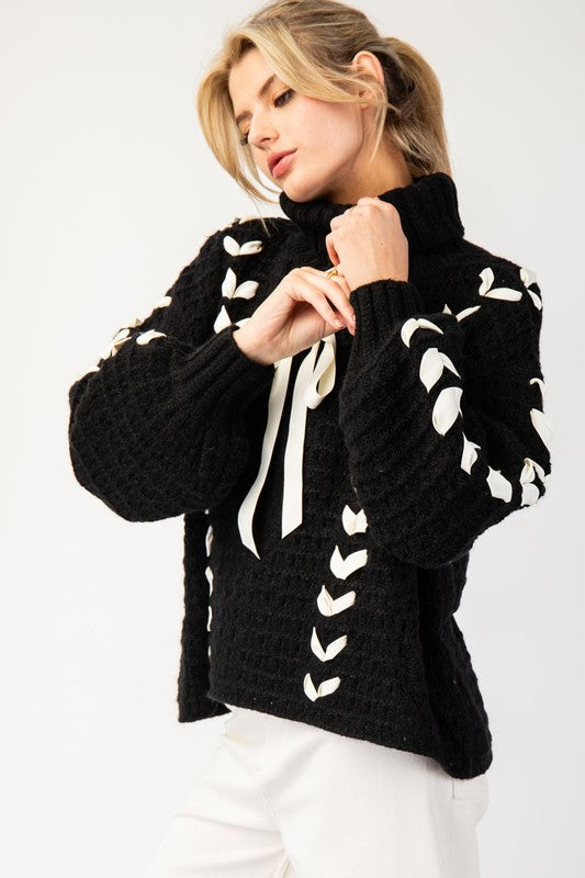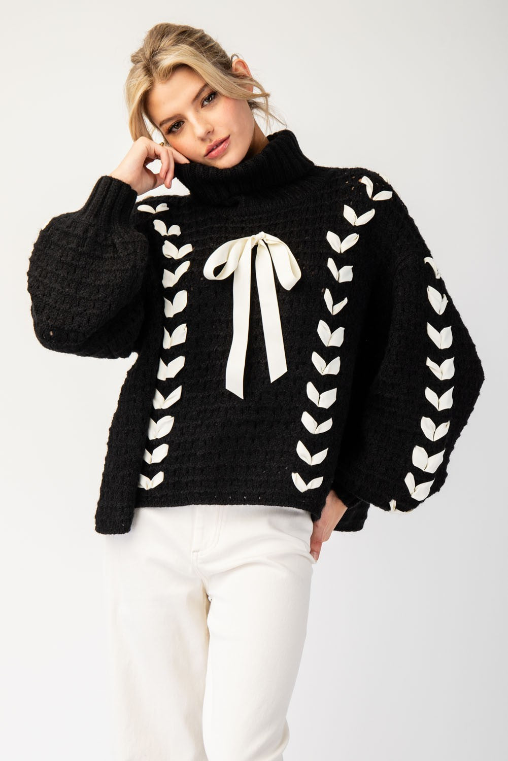 Long Sleeve Crochet Sweater Featuring A Textured Pattern, Lace Ribbons Throughout, A Ribbed Turtle Neck, Ribbed Cuffs Creating A Bubble Sleeve Effect, A Finished Bottom And Is A Relaxed Silhouette.