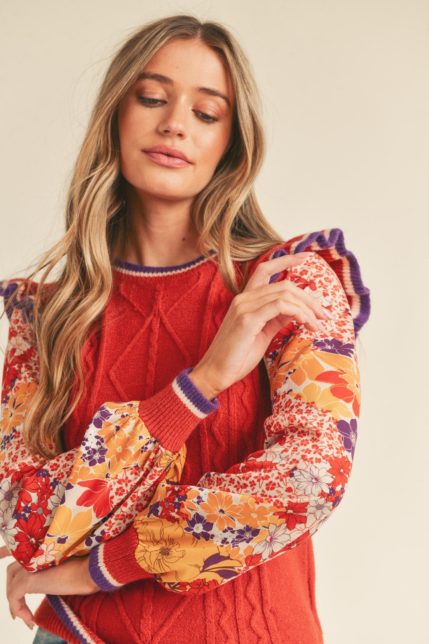 + Cable Knit Sweater Top With Woven Floral Sleeves
