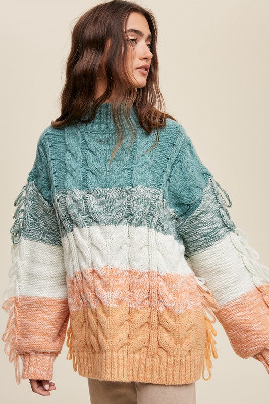 - Chunky Cable Knit Striped Fringe Detail Sweater