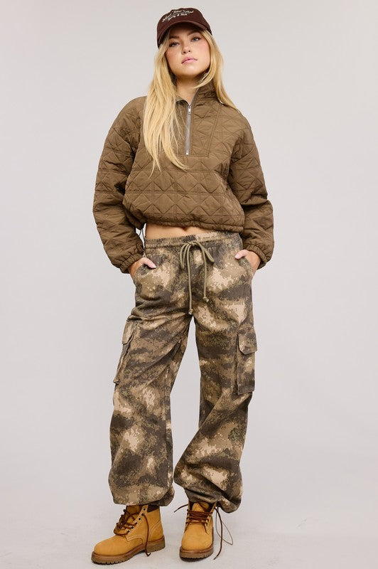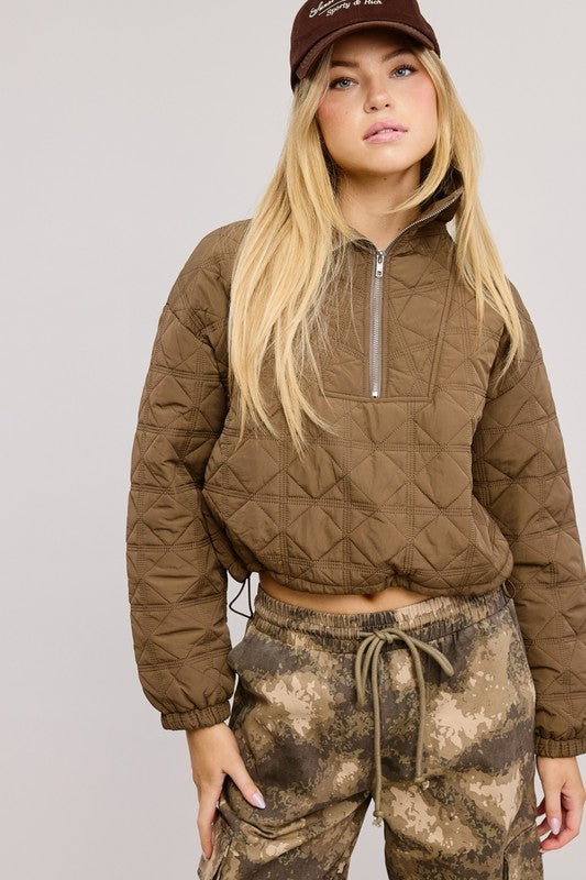 Quilted Puffer Pullover Long-Sleeve Sweater Top With Collared Zipper, Drawstring Hem, And Cropped Fit.100% Nylon