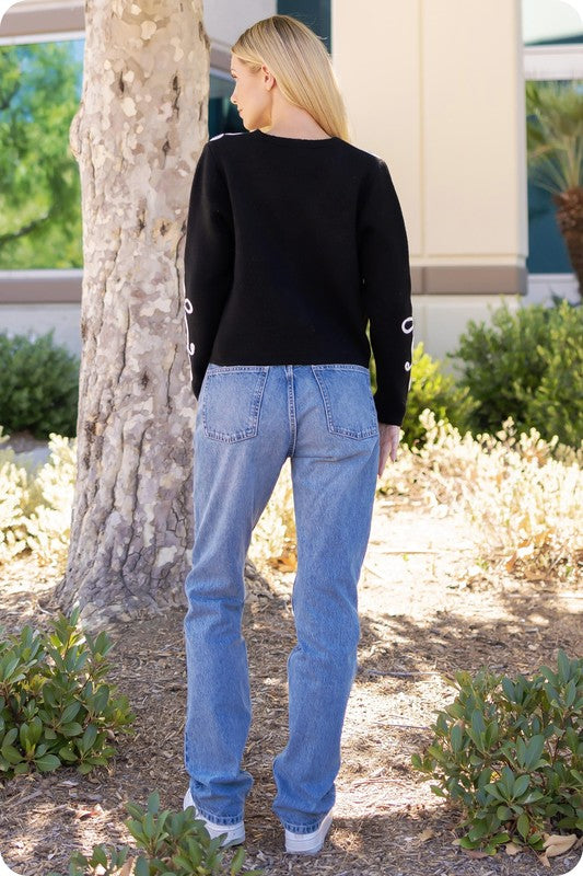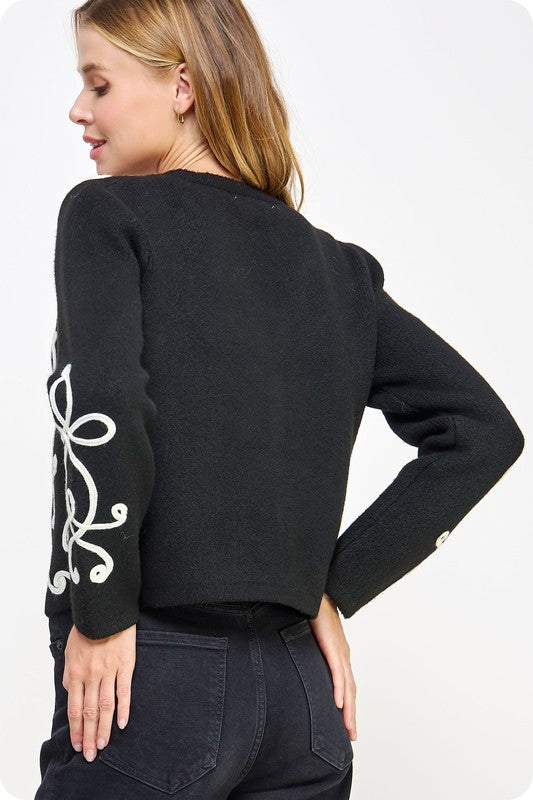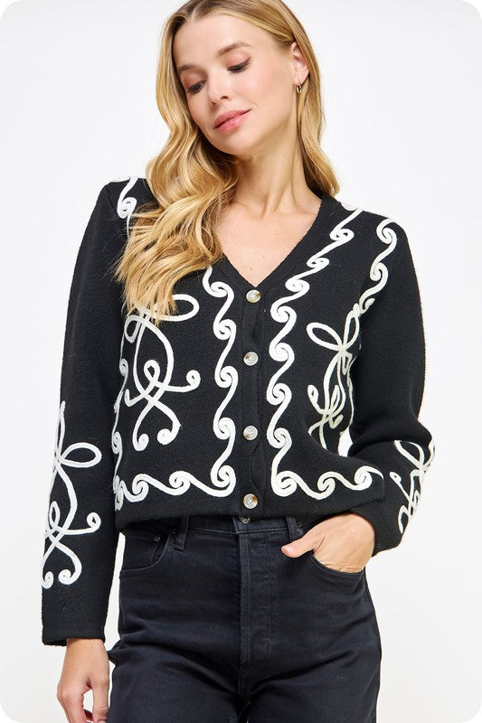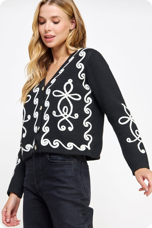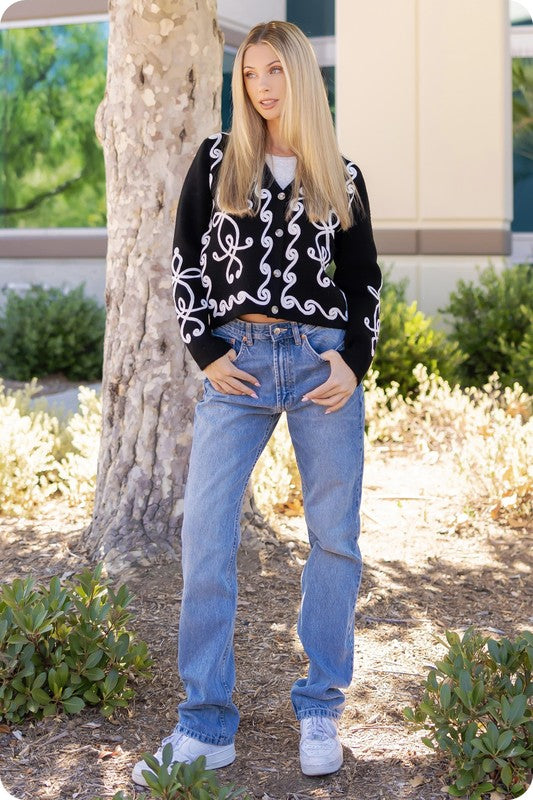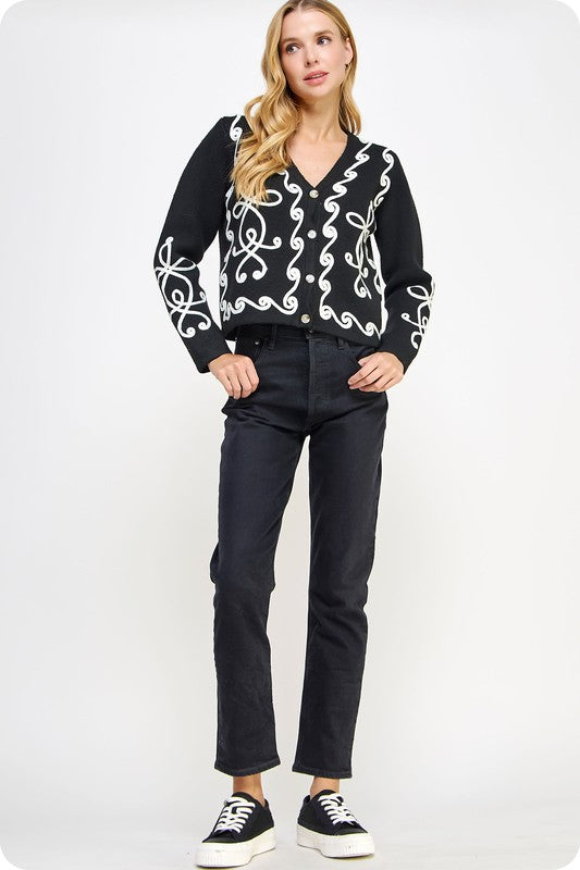 Contrast Floral Squiggle Embroidered Cardigan Sweater In Knit Fabric. This Soft Cardigan Features Long Sleeves, Button Closure At Front, A V Neckline, And Embroidery Work Throughout.