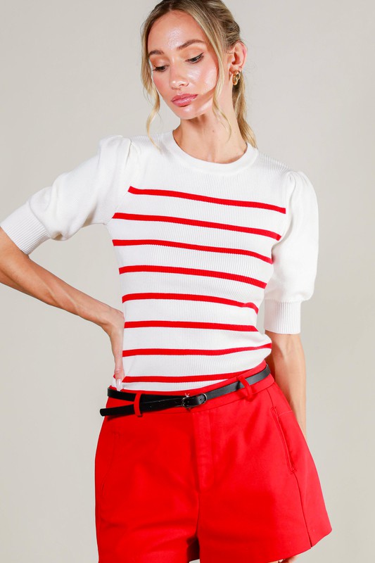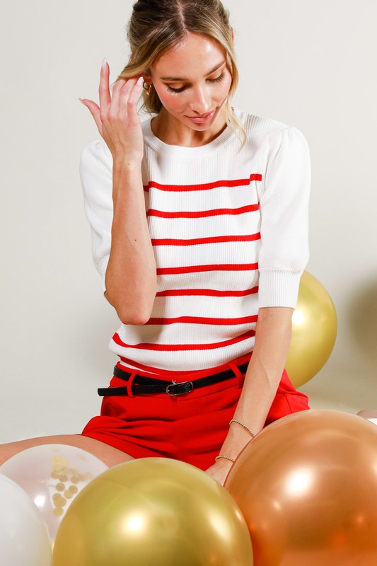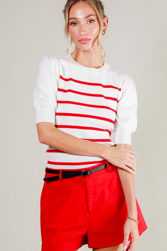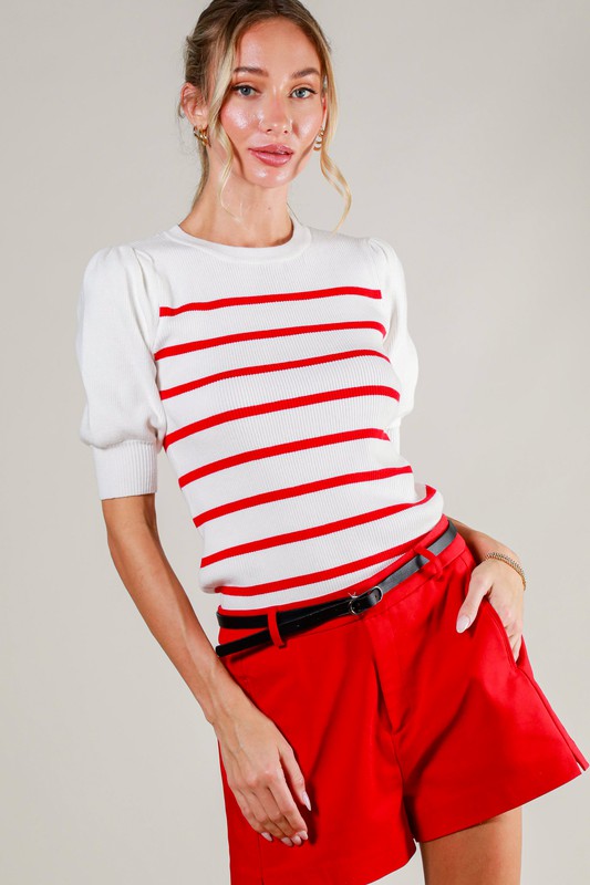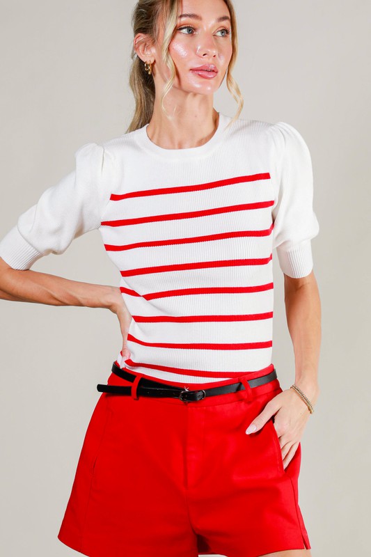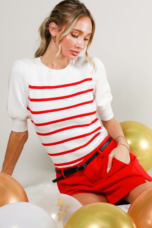 Cream/Red Short Puff Sleeve Striped Sweater Top