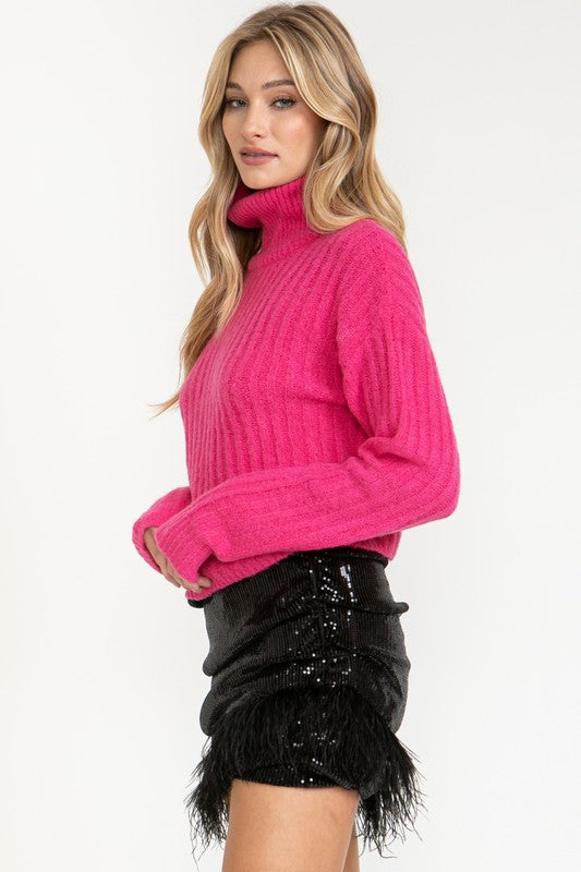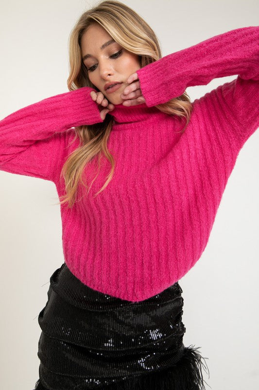 Hot Pink Cropped Turtle Neck Ribbed Sweater