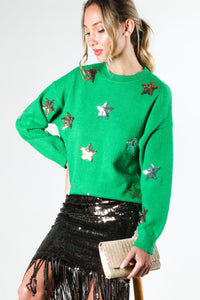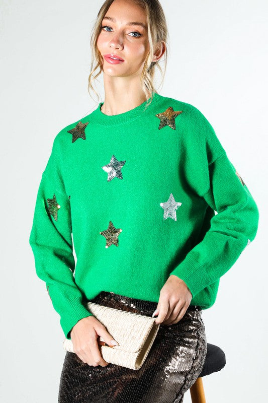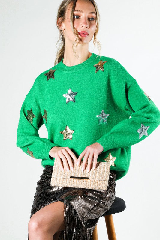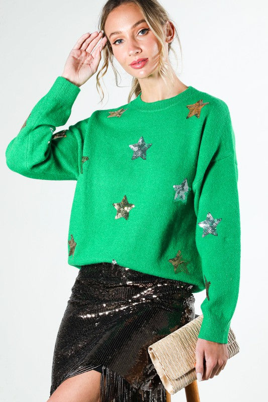 Crew Neck Long Sleeve Star Sequin Detail Sweater TopGraphicFabric Contents48%Viscose 28%Polyester 24%Nylon