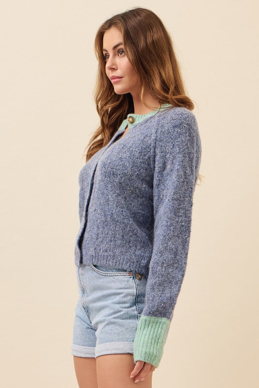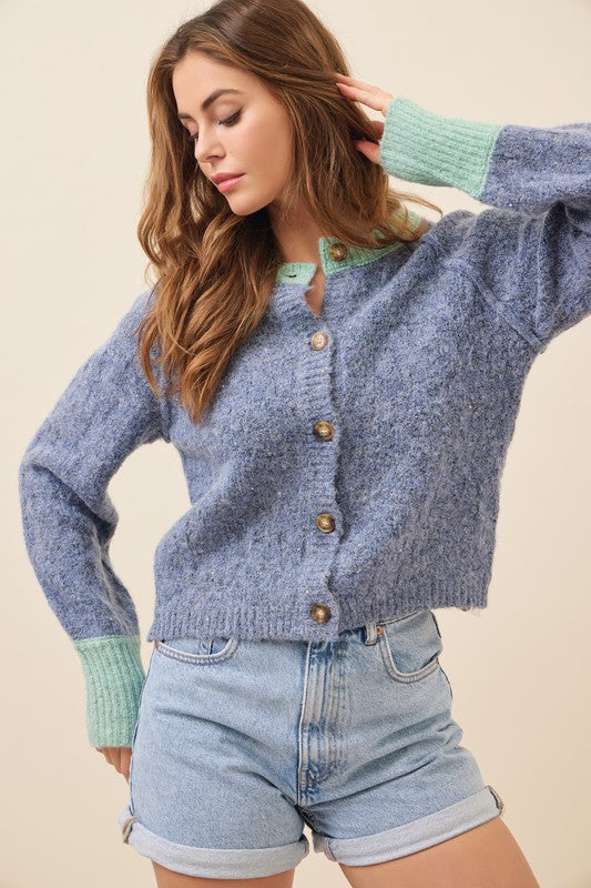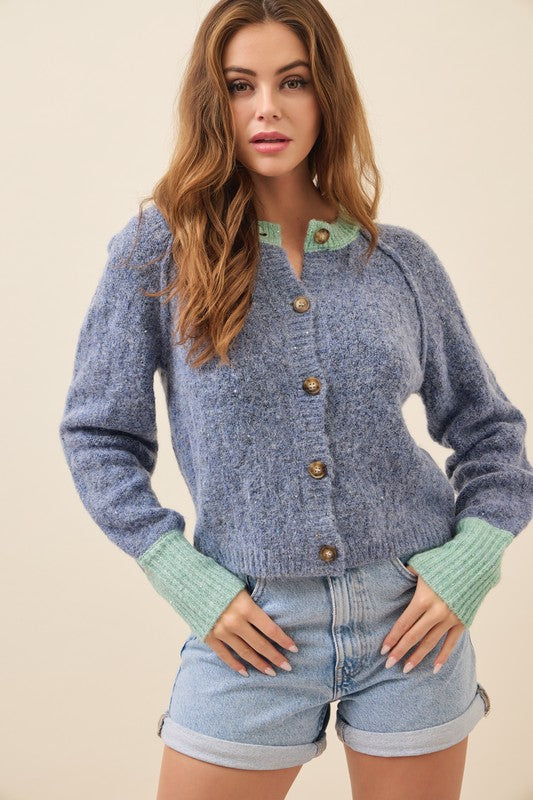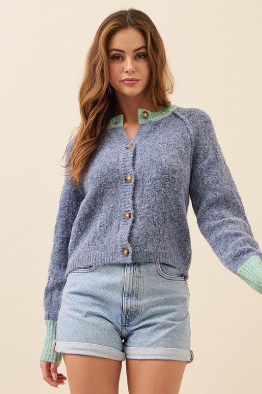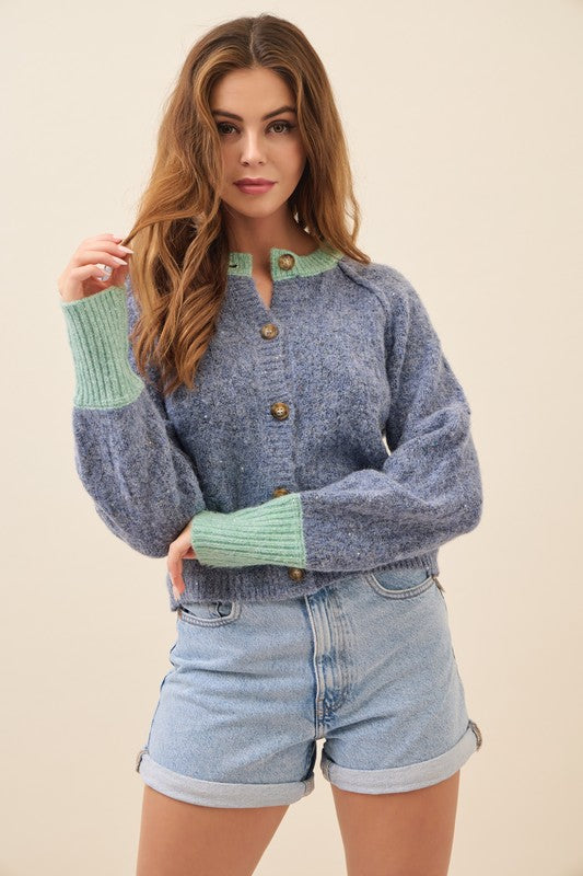 Allie Textured Knit Raglan Sleeve Cardigan With Contrast 45% Acrylic 40% Polyester 9% Nylon 5% Wool 2% Spandex