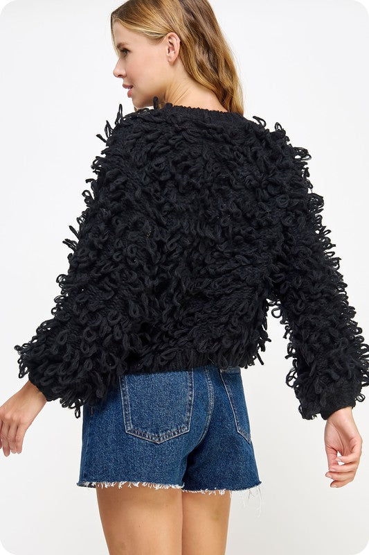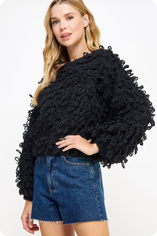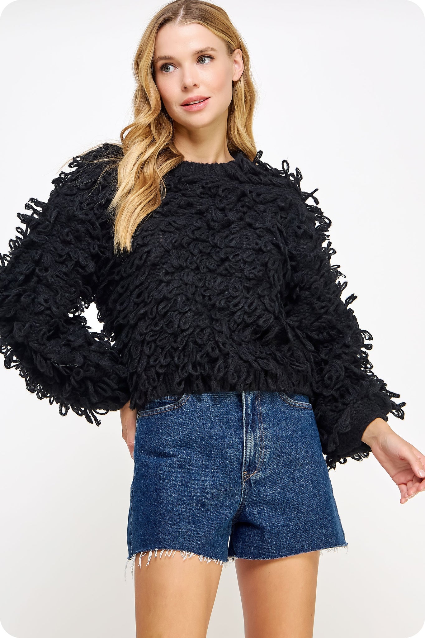 Knitted Fringe Shaggy Sweater In Knit Fabric. This Pullover Style Features A Crew Ribbed Neckline, Long Sleeves, Ribbed Hem, And Dropped Shoulder.