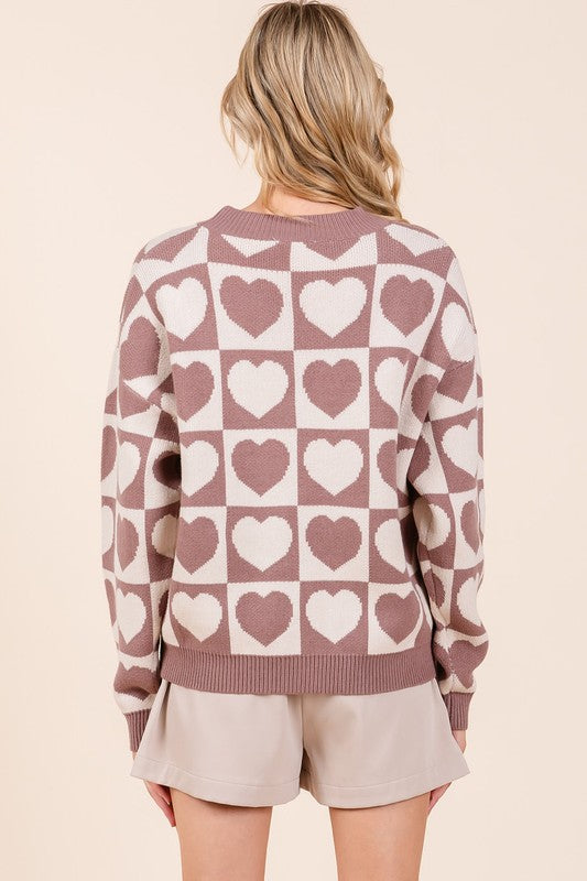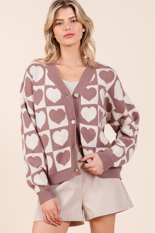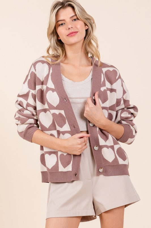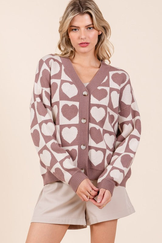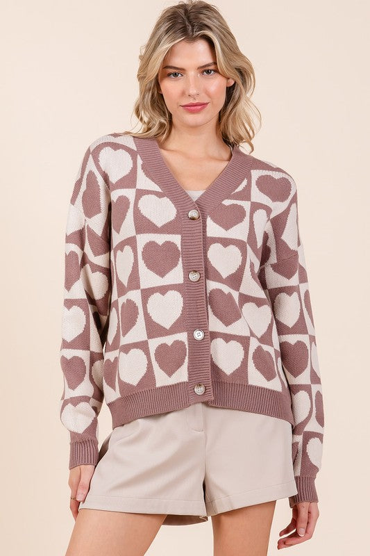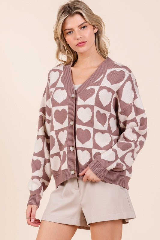 Sweater Knit Fabric - Checkered Heart Print - V-Neck - Button Front - Long Sleeve - Ribbed Detail Along Sleeve Cuffs And Placket - Traditional Cardigan Shape - Relaxed Fit Model Is 5'8" And Wearing Size Small Fabric Contents 50% Viscose 22% Nylon 28% Pbt