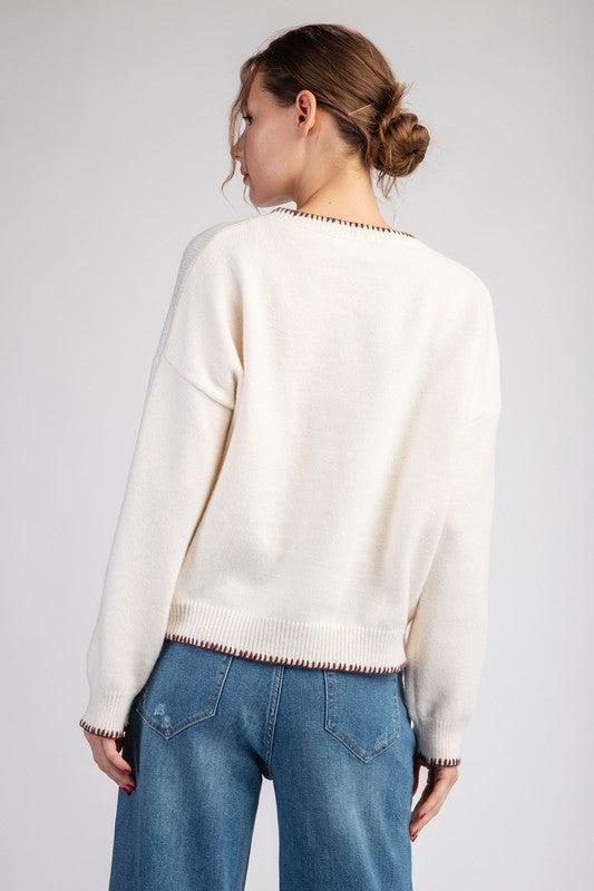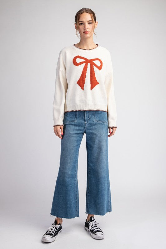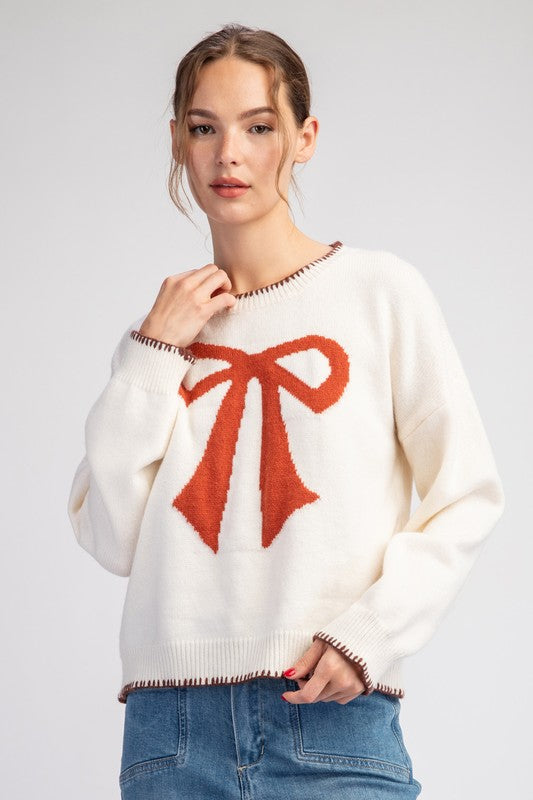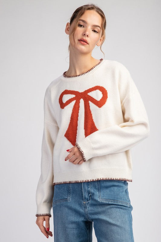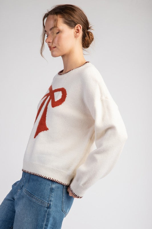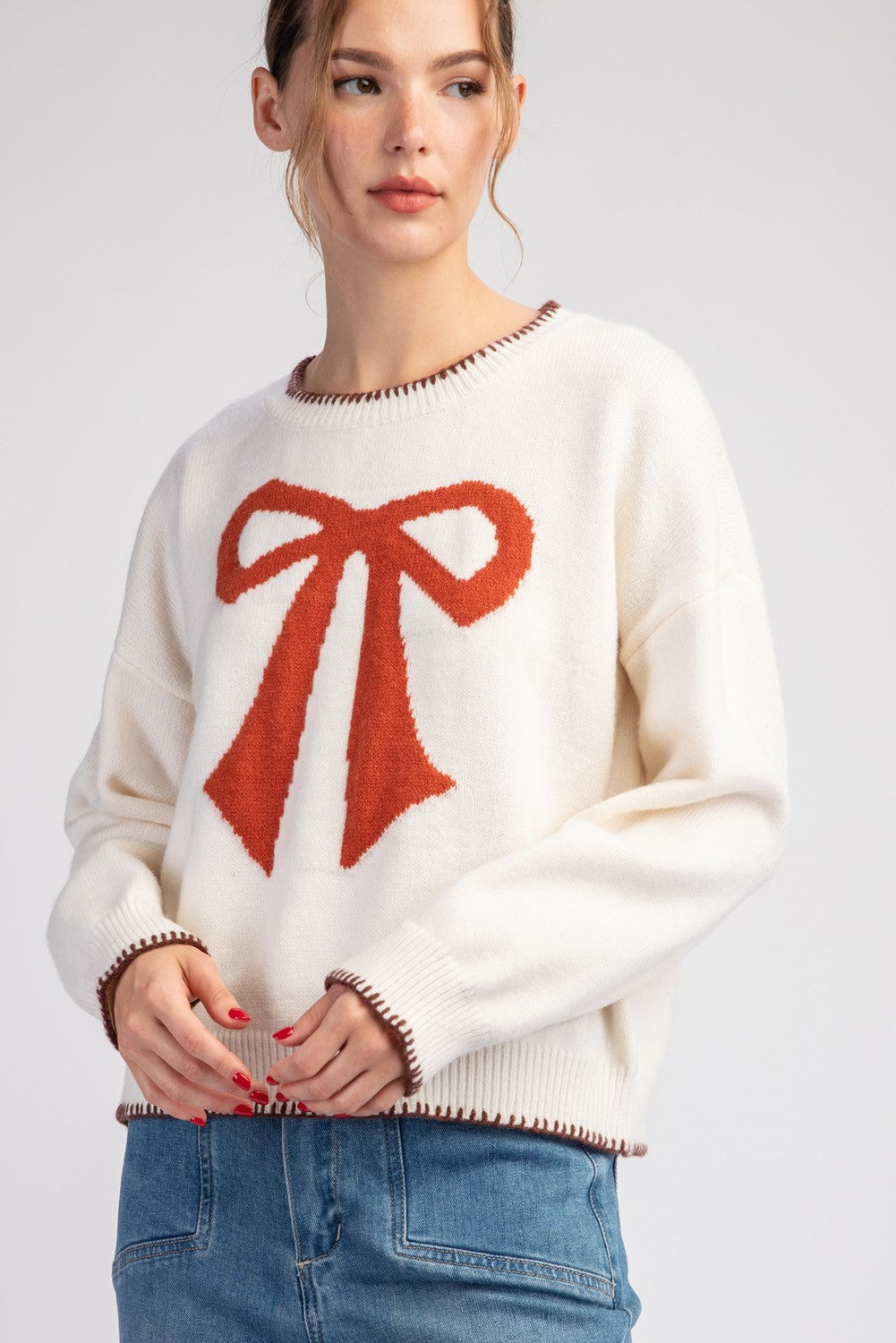 Long Sleeve Sweater Top Featuring A Rounded Neckline With Stitch Detailing, Ribbed Cuffs With Stitch Detailing, A Ribbed Bottom Band And A Bow Print On The Front. Model Is 5'8" And Wearing A Small.Fabric Contents97%Acrylic 3%Cotton