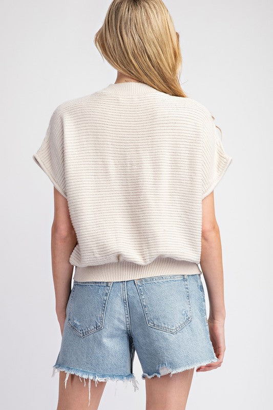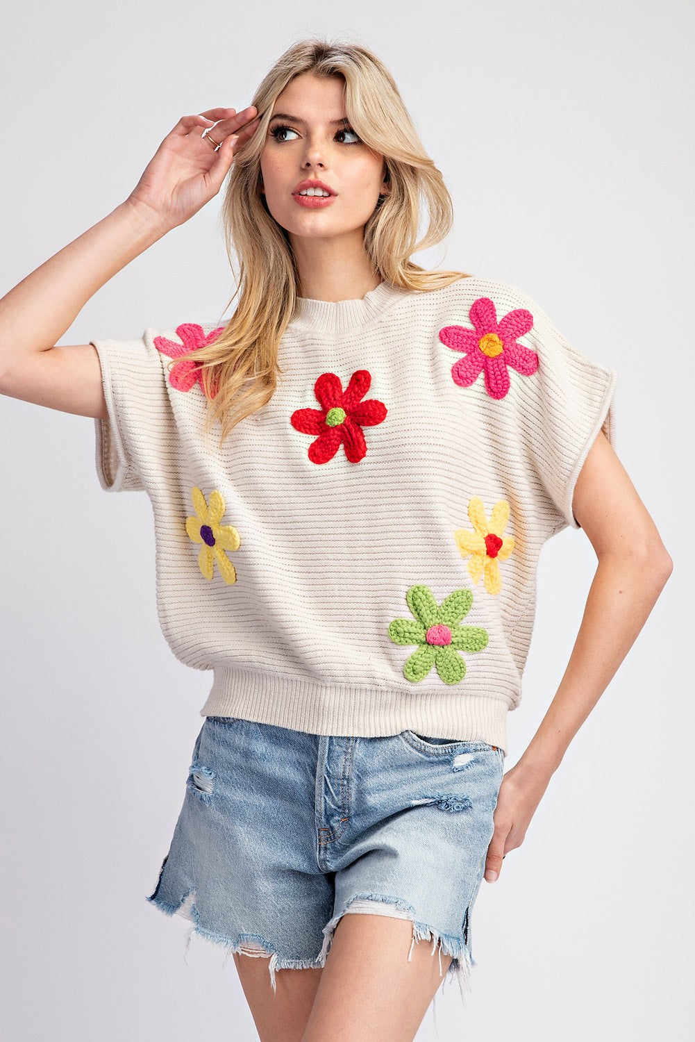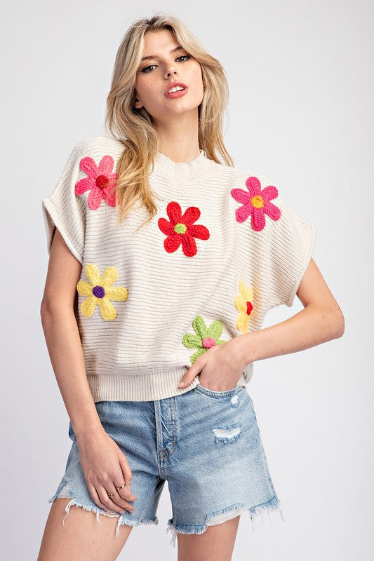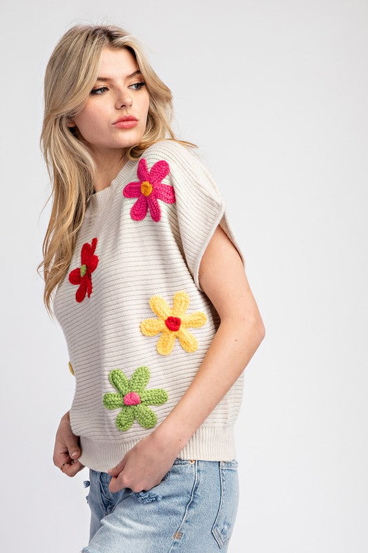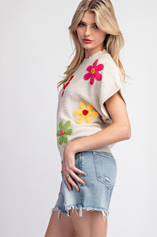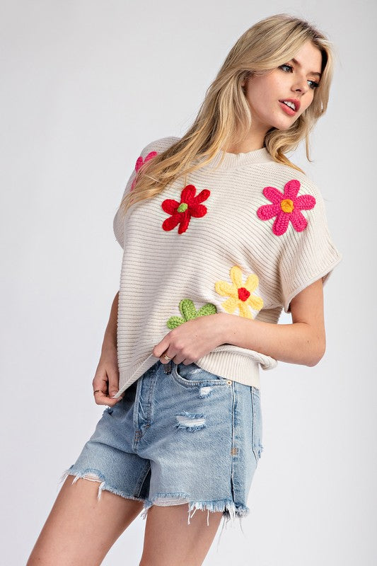 Oatmeal Flower Pattern Short Sleeve Sweater Top