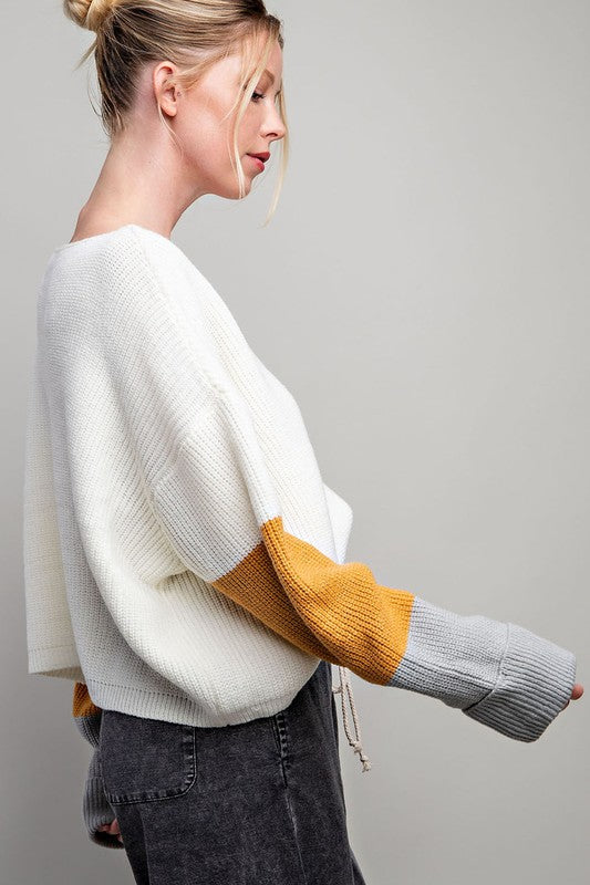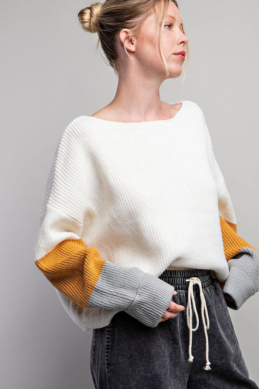 Long Sleeve Knit Sweater Top Featuring A Solid Relaxed Body, Color Block Sleeves, A Boat Neckline, A Ribbed Bottom Band And Cuffs.