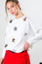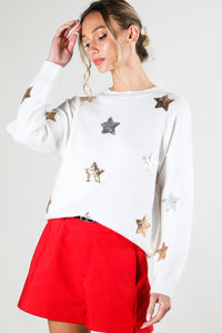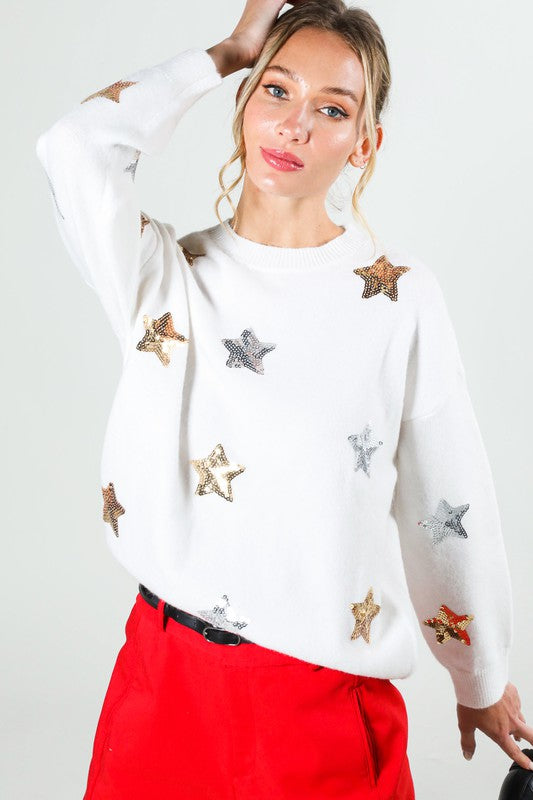 Crew Neck Long Sleeve Star Sequin Detail Sweater Top