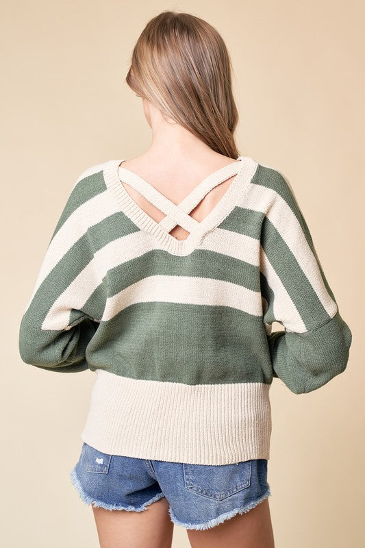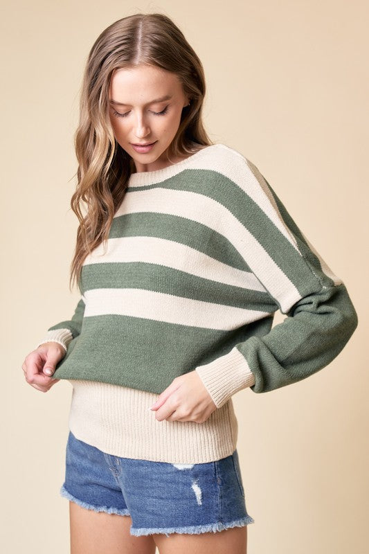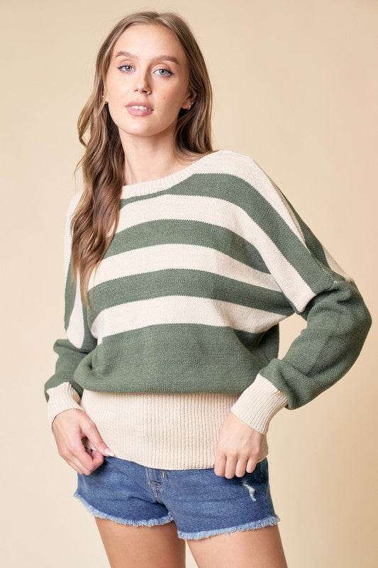 Striped Oversize Sweater Top Self:39%Acrylic, 31%Polyester, 30%Nylon Total Length 25 1/2"| Bust 24"| Waist 13 1/2"| Sleeve Length 16"| Shoulder 32"Model Is 5'8" | Bust 32b" | Waist 24" | Hips 33" Wearing Size Small