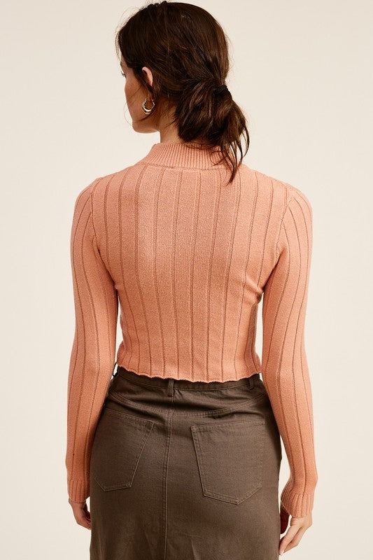 Apricot Crush Overlap Knit Mock Neck Crop Sweater Top