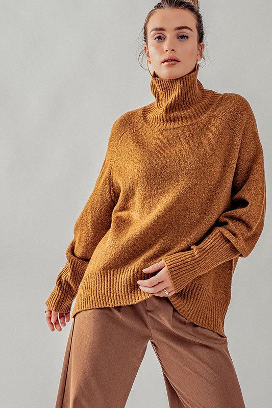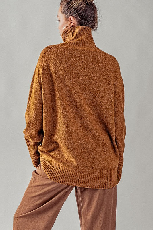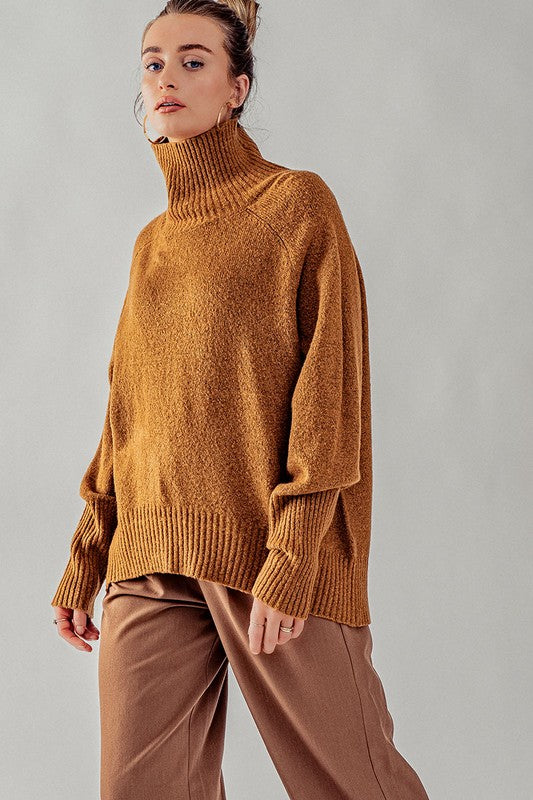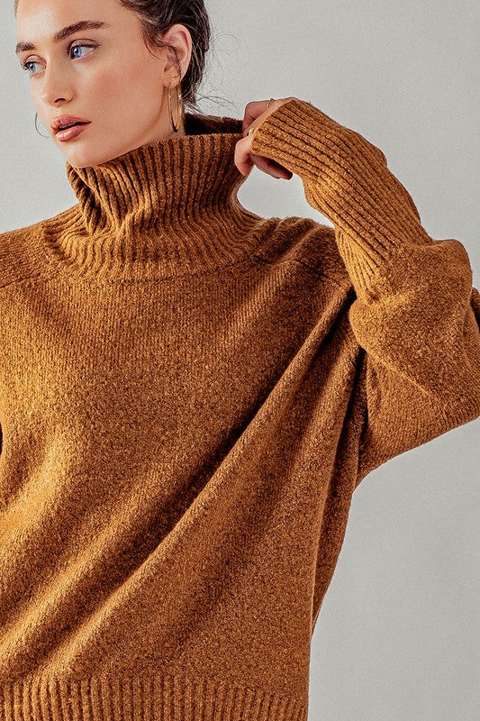 Pale Brown High Turtle Neck Drop Shoulder Knit Top