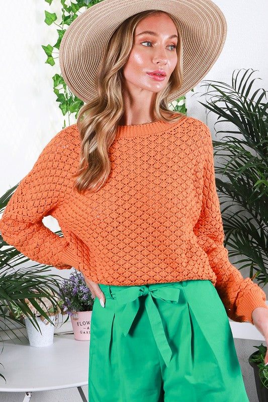 Pumpkin Round Neck Long Sleeve Crochet Sweater Top