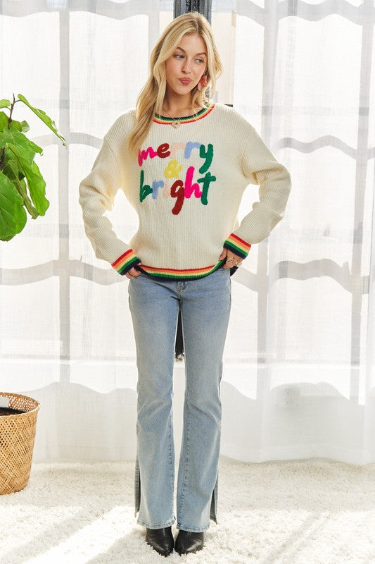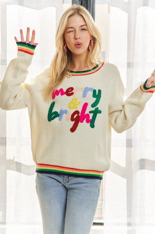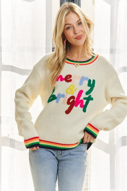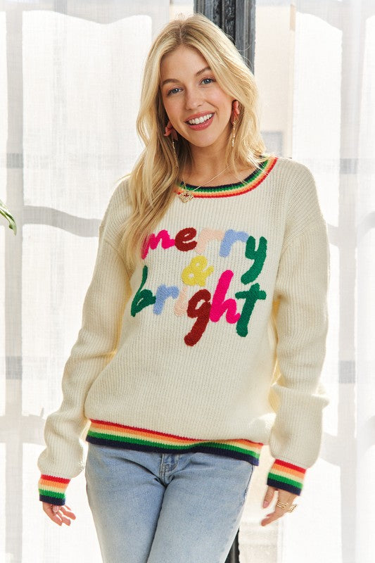 Drop Shoulder X-Mas Sweater Top With Rainbow Band Accent