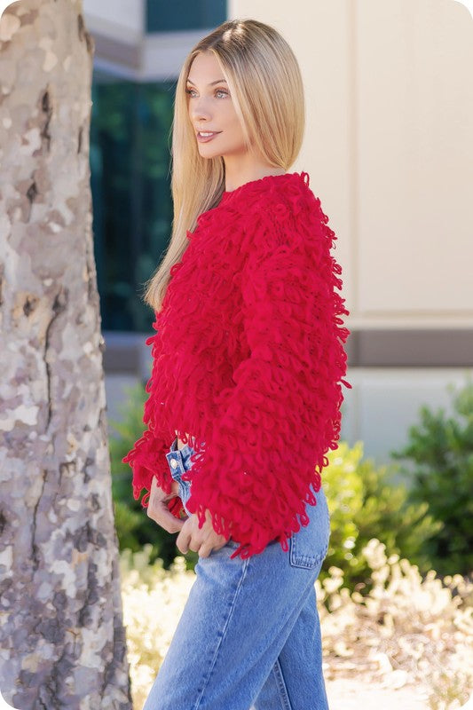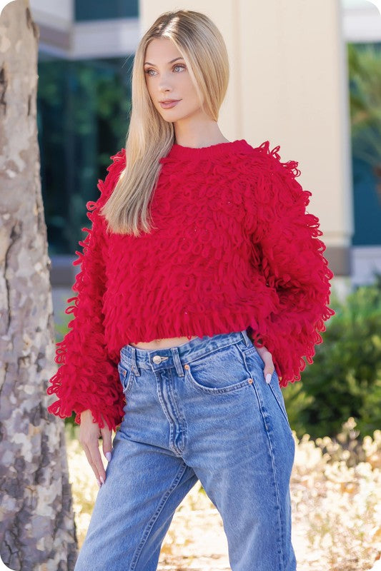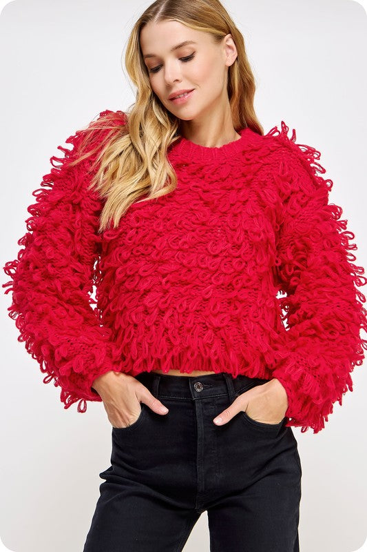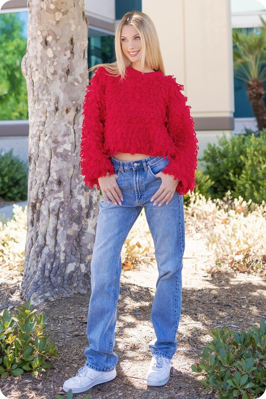 Knitted Fringe Shaggy Sweater In Knit Fabric. This Pullover Style Features A Crew Ribbed Neckline, Long Sleeves, Ribbed Hem, And Dropped Shoulder.