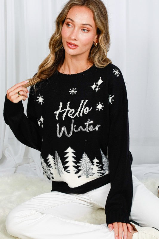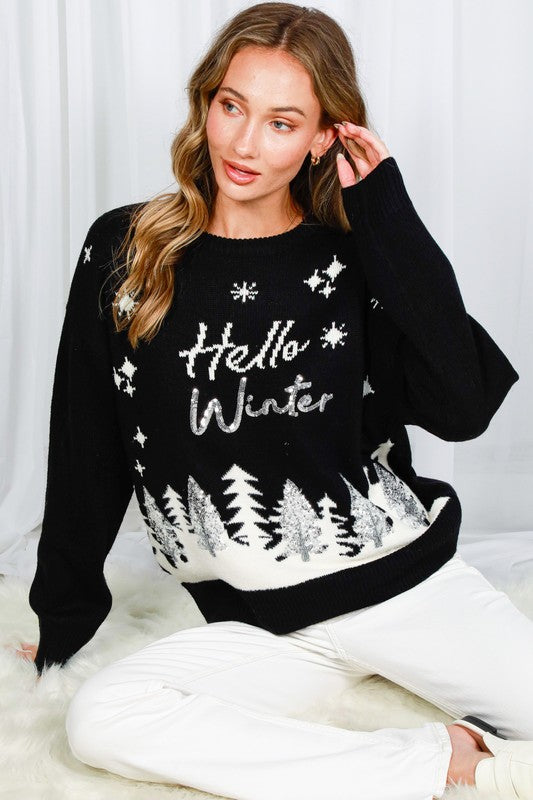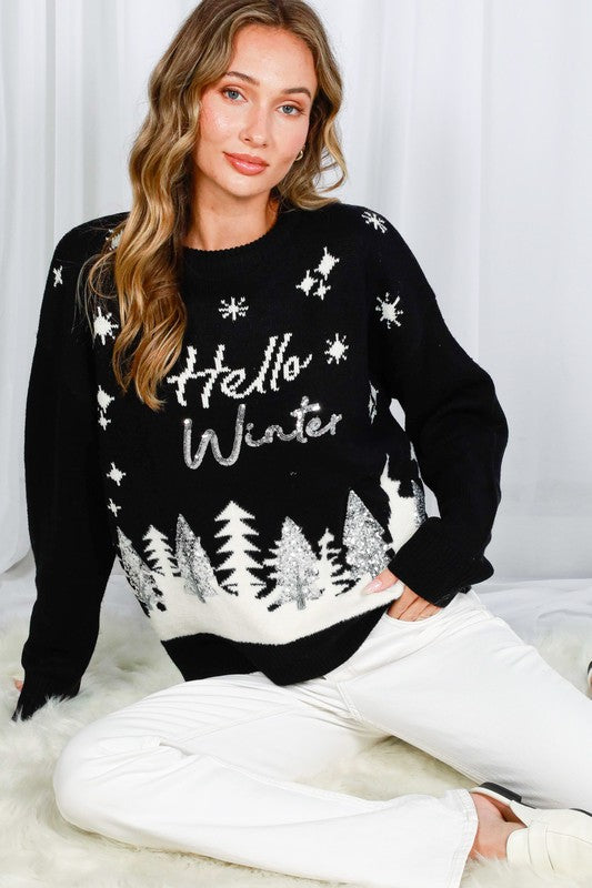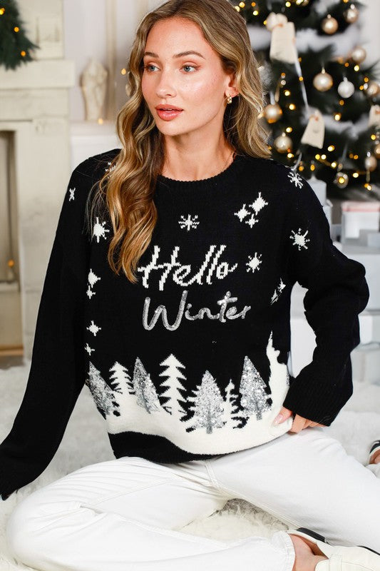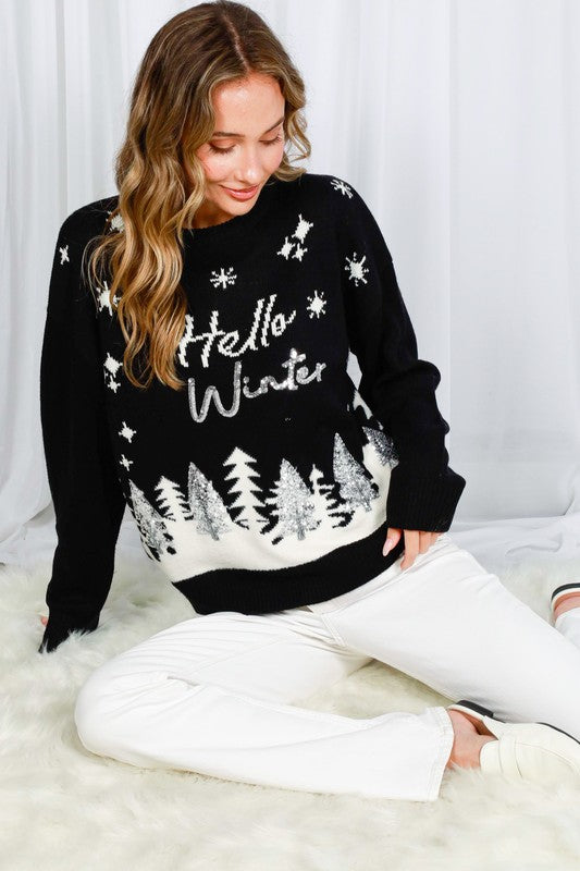 Black Hello Winter Tree Sequin Detail Sweater