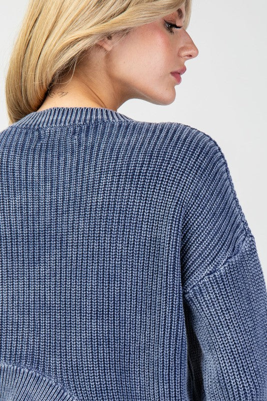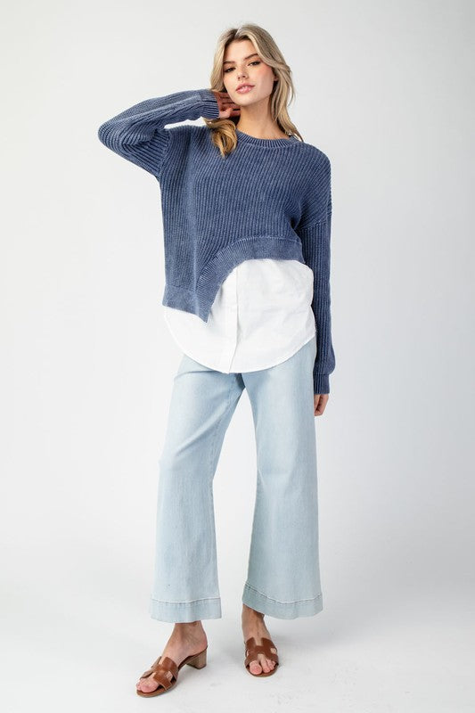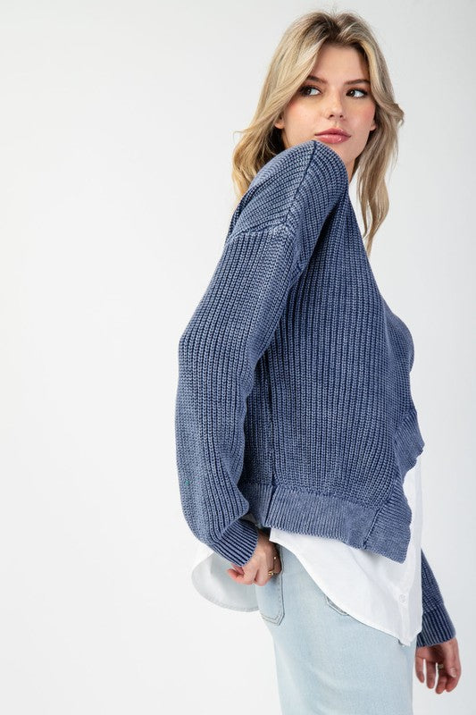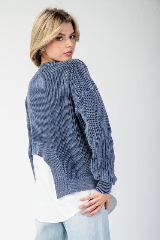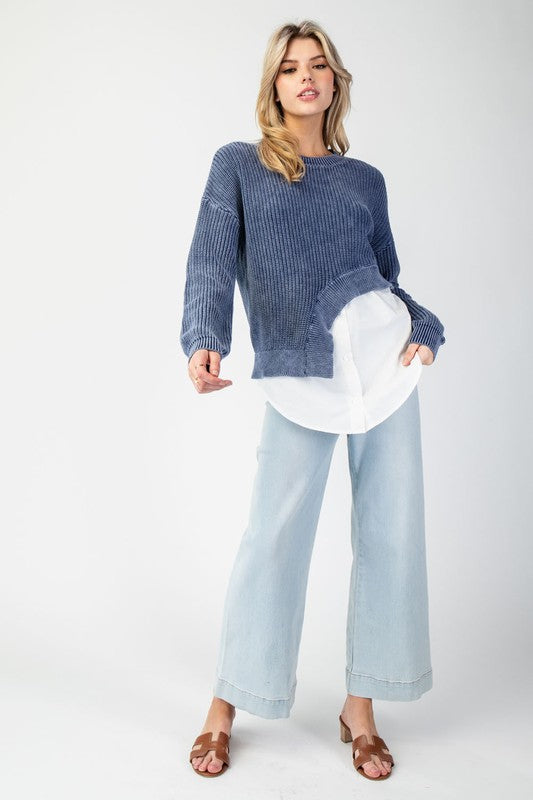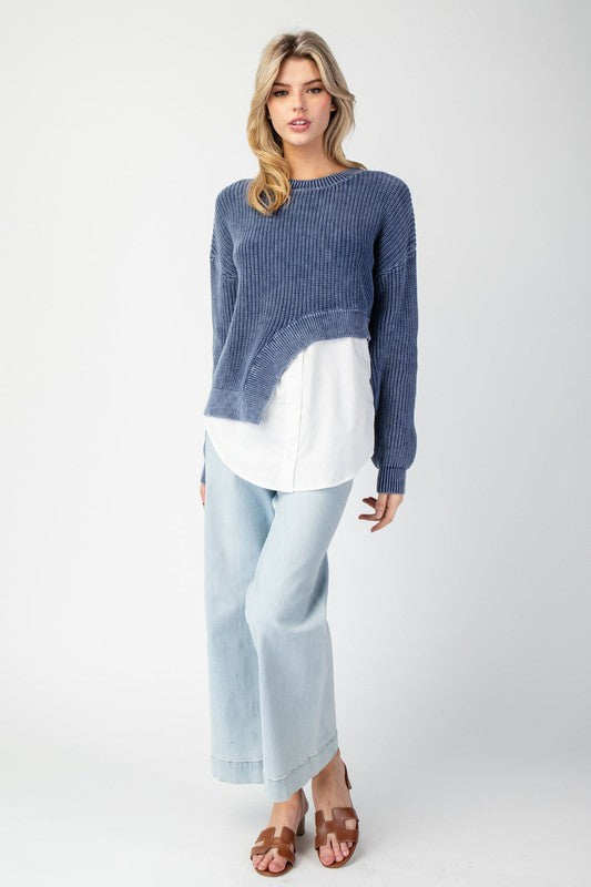 Stone Washed Long Sleeve Sweater Top Featuring A Rounded Neckline, Dropped Shoulders, Ribbed Cuffs, An Asymmetrical Bottom Cut With A Layered Button Down Shirt Underneath That Features A Rounded Bottom Hem With Two Side Slits.