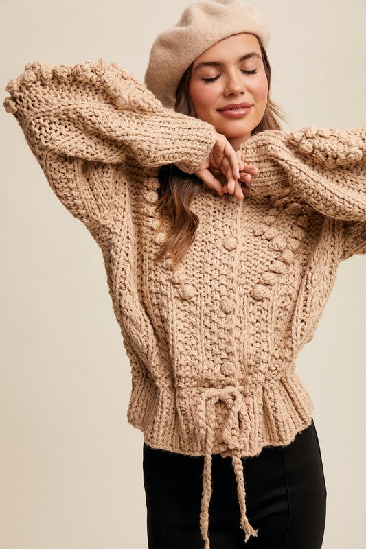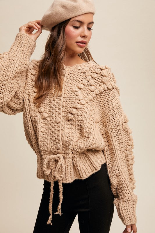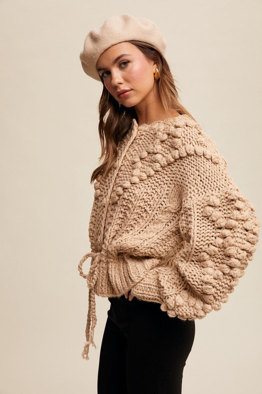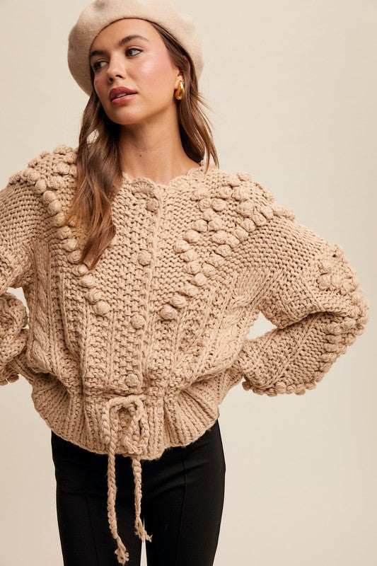 Taupe Hand Crochet Tufted Dot Cable Knit Cardigan