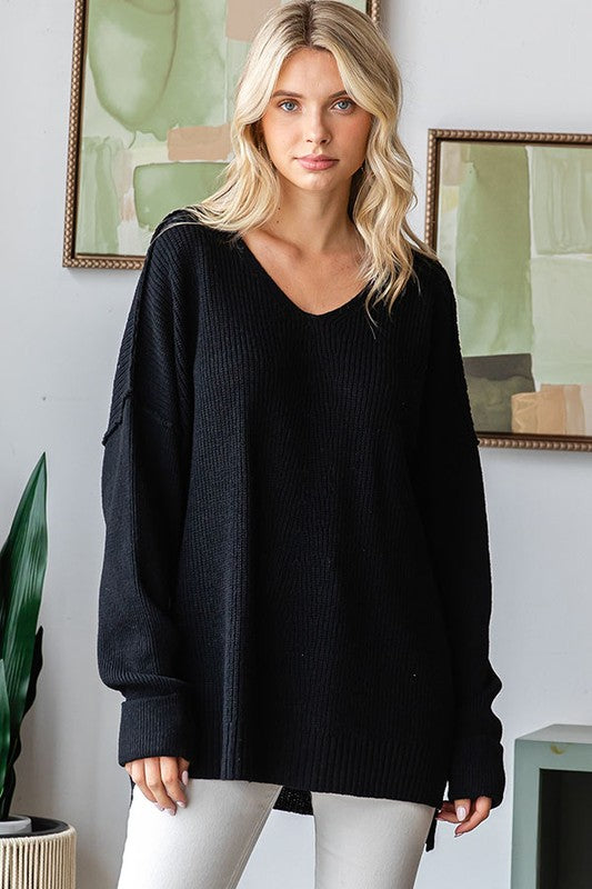 Solid Color Loose Fit Knitted Sweater Featuring V Neckline, Dropped Shoulder Long Sleeves, Ribbed Hi-Lo Hemline, And Exposed Seam Detail. Fabric Contents85% Acrylic 15% Cotton