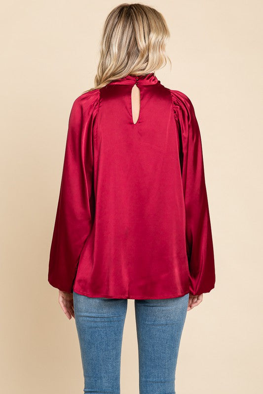 Burgundy Cowl Neck Long Sleeve Satin Blouse Top