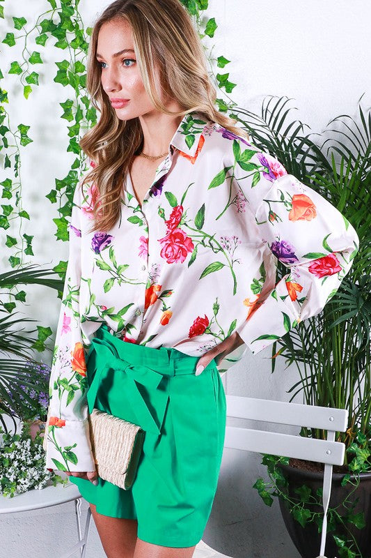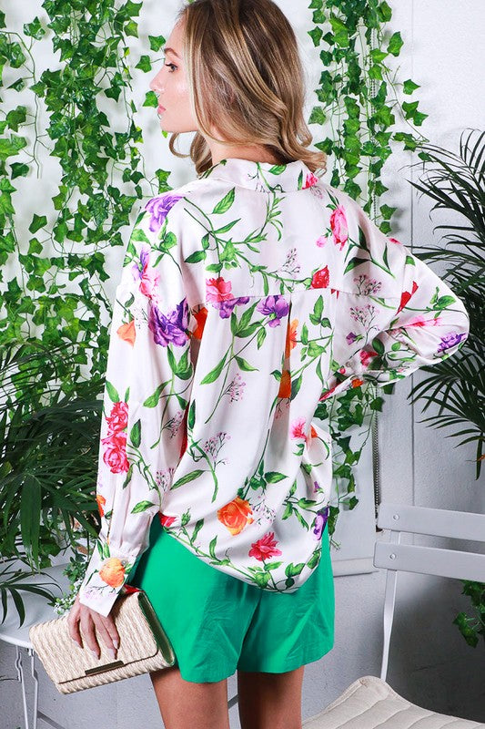 Long Sleeve Floral Printed Satin Blouse Top