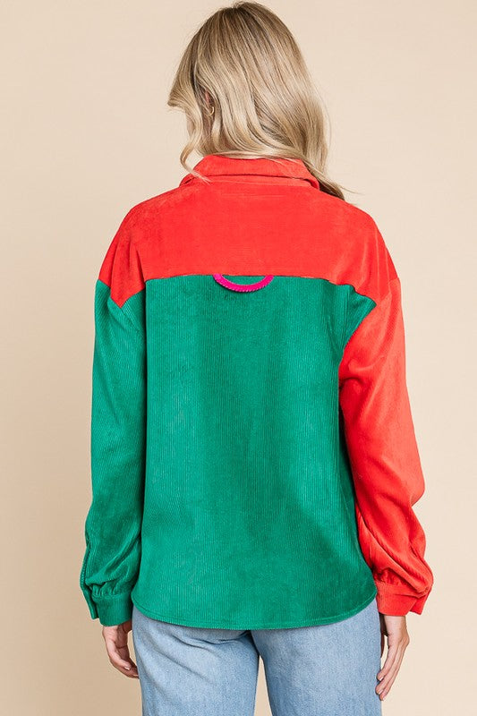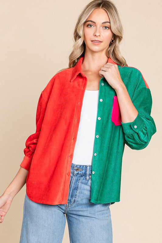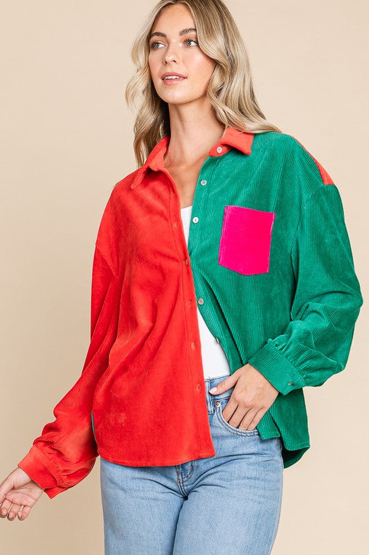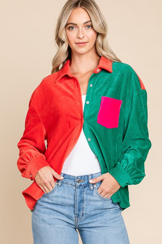 Color Block Cotton Rib Long Sleeve Button Down ShirtsFabric ContentsSelf:65%Cotton 32%Polyester 3%Spandex