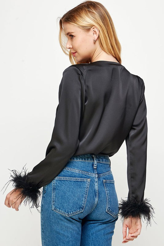 Color Block Satin Bodysuit With Feather Trim. This Color Block Surplice Bodysuit Features A V-Neckline, Long Sleeves With Feather Trim At Cuff, Slim Shoulder Pads And Snap Button Closure At The Bottom.