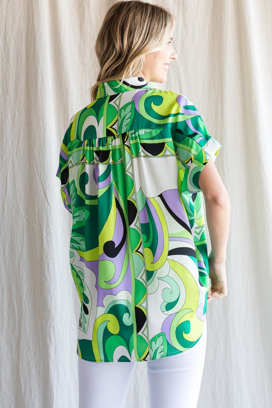Colorful Print Top With A Collared Neck, Ruched Shoulder, Back Shirring Detail, Cuffed Short Sleeves, And Curved Hemline.