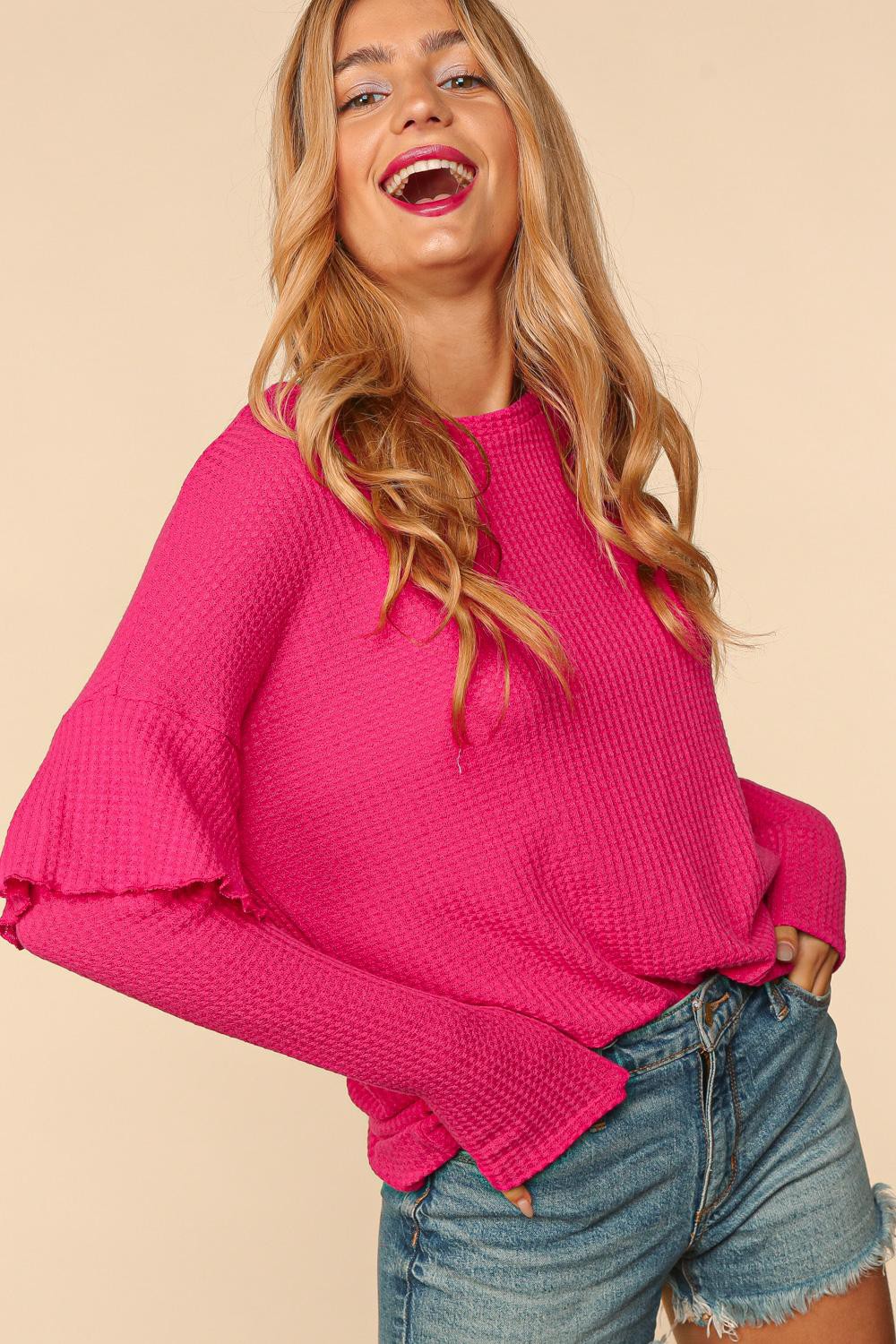 Round Neck Drop Shoulder Ruffle Detail Long Sleeve Loose Fit Waffle Solid Knit TopFabric Contents97% Polyester 3% Spandex