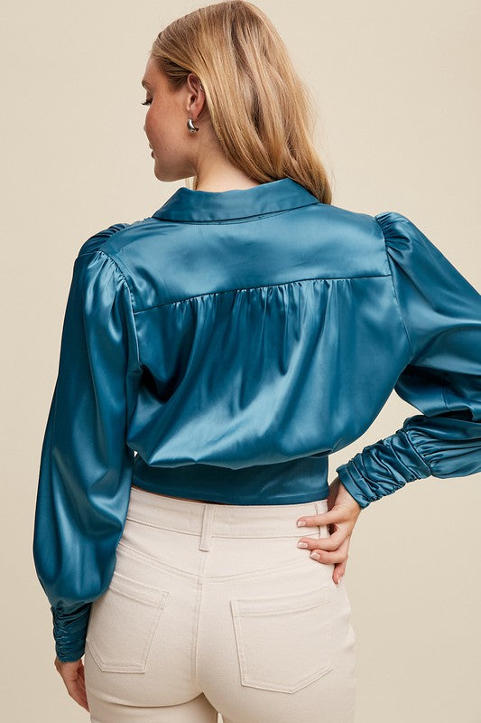 - Wrap Style Satin Blouse Top- Stretched- V-Neck With Wrap Detail And Button Closure On Waist- Puff Sleeves With Buttons On Cuffs- Model Is 5' 7" 31-24-35 And Wearing A Size SmallFabric Contents92% Polyester 8% Spandex