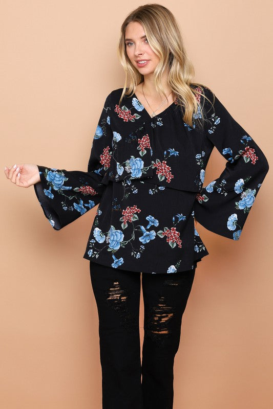 Floral Bell Long-Sleeve V-Neck Tiered Loose-Fit TopFabric Contents100% Polyester