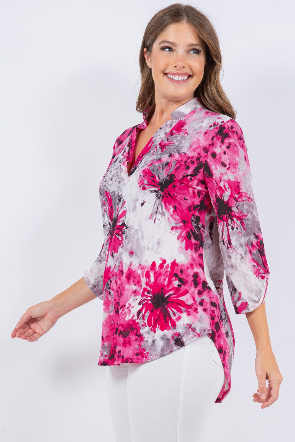 Pink Ivory Floral Print V-Neck Top With 3/4 Sleeves