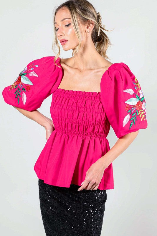 Fuchsia Puff Short Sleeve Embroidery Detail Blouse Top