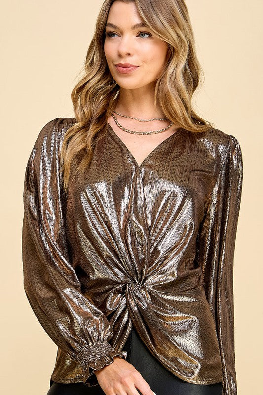 Metallic Fabric V Neck Long Sleeve TopFabric Contents100%Polyester