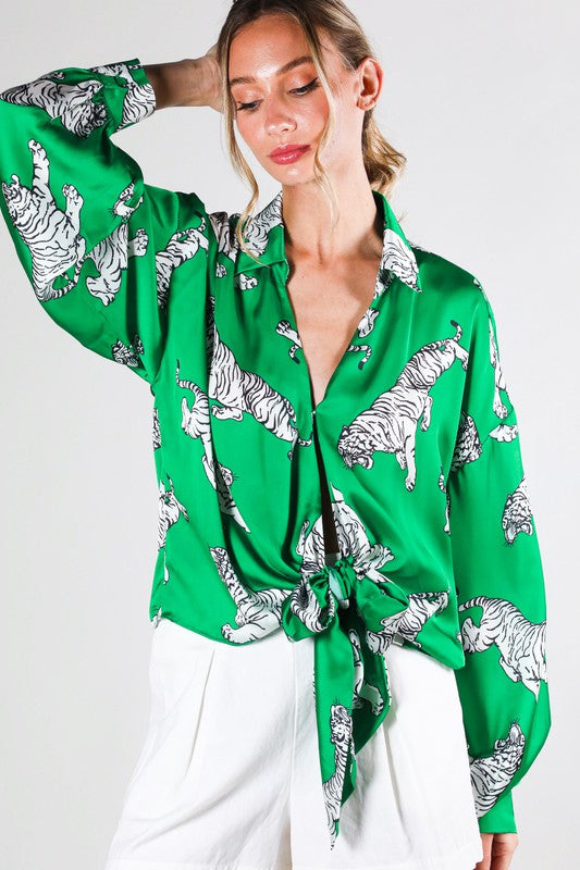 Long Puff Sleeve Tie Front Tiger Printed Satin Top