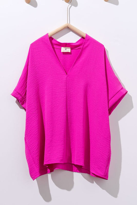 Hot Pink Oversized Vneck Folded Short Sleeve Top