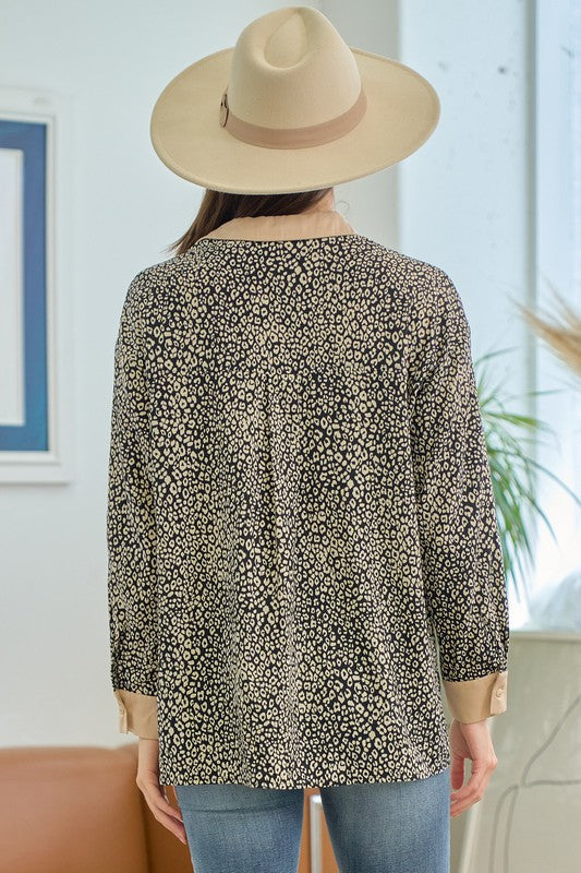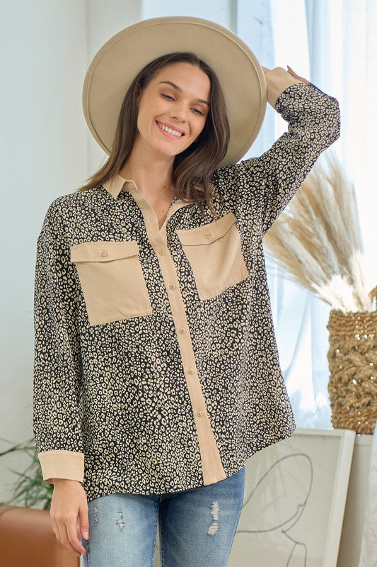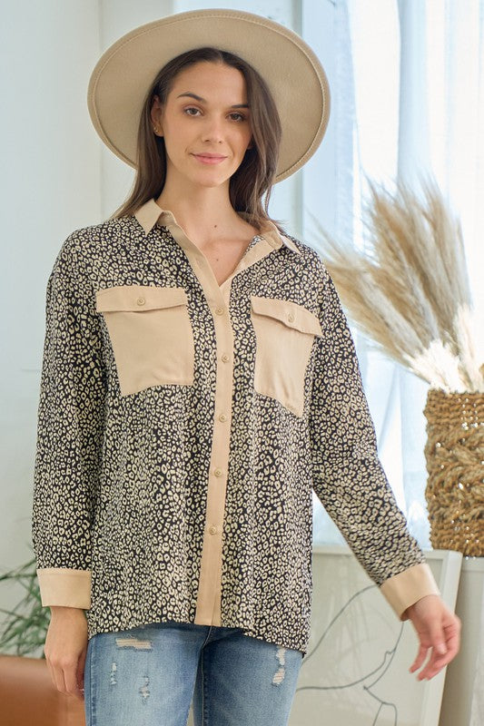 Leopard Button Down Shirt With Double Pocket Self:100%polyester | Cont:65%rayon, 35%polyester Total Length 28 1/2"| Bust 21 1/2"| Sleeve Length 21 1/4"| Shoulder 21"