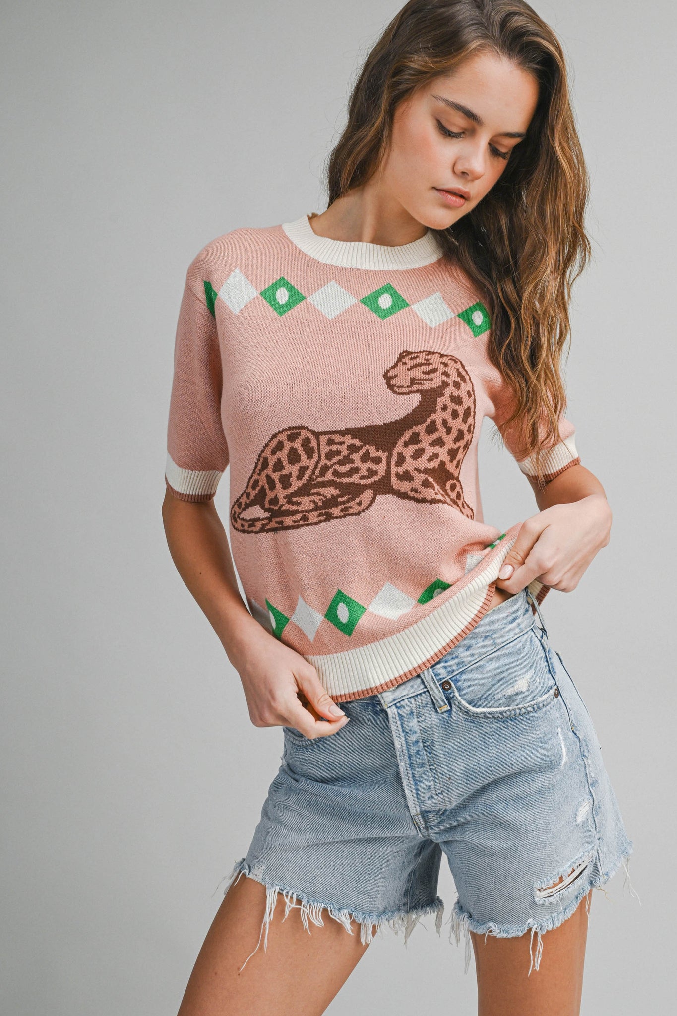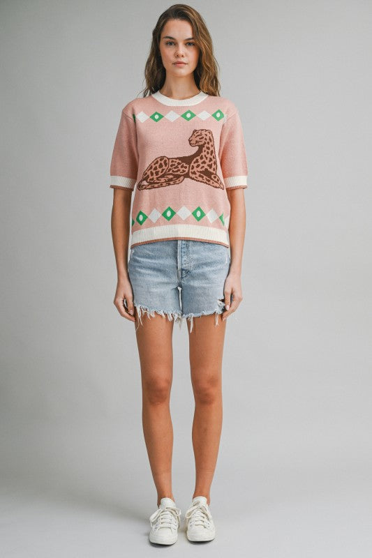 This Short-Sleeve Knit Top Features A Bold Leopard Graphic With Retro-Inspired Geometric Accents, Finished With Contrast Ribbed Trim For A Clean, Polished Look. Soft, Lightweight, And Easy To Style, It's The Perfect Statement Sweater Tee For Casual Outfits, Weekend Wear, And Transitional Seasons.