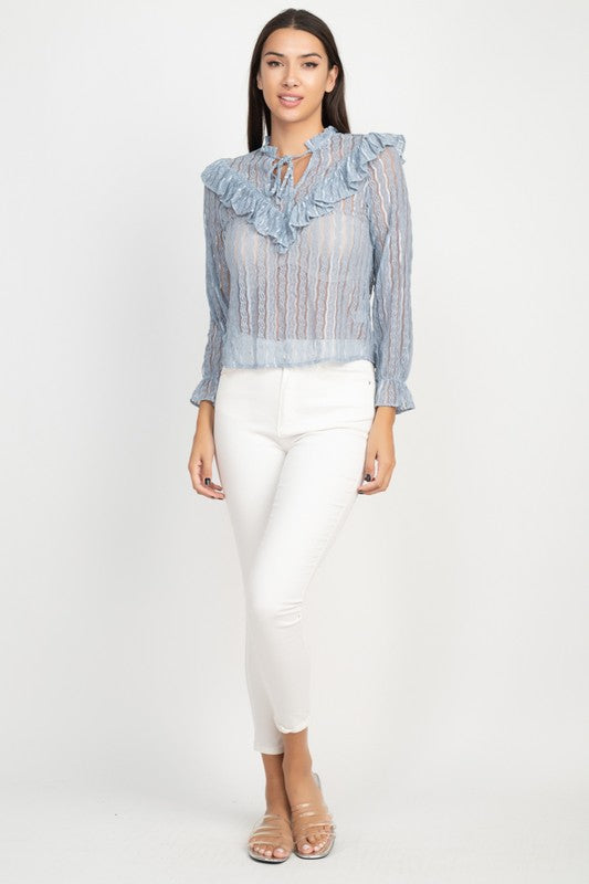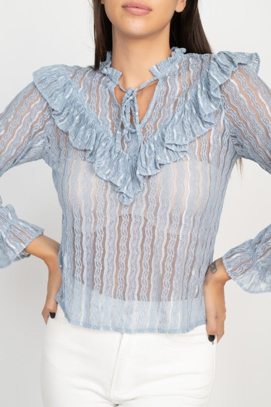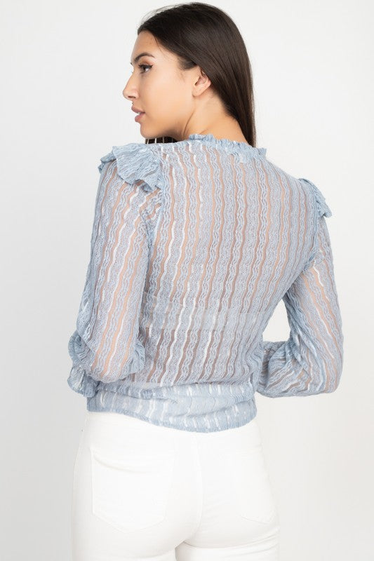 A Woven Blouse Featuring An All Over Lace Pattern, Ruffled Details, Long Sleeves, And A Mock Neckline With A Neck Tie. Fabric Contents95% Nylon 5% Spandex