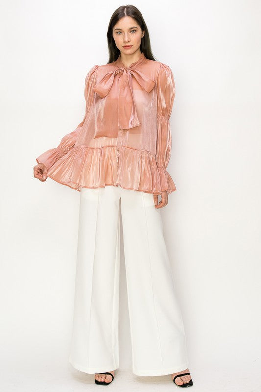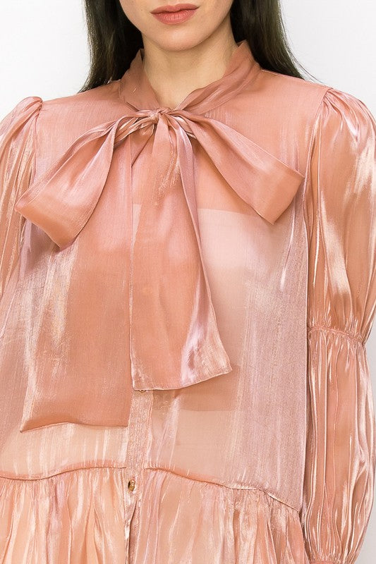 Shimmer Long Sleeve Neck Ribbon Button Down Top