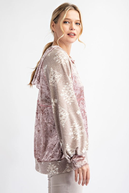 Velour Tribal Print Contrast Hoodie Top With Raglan Sleeves