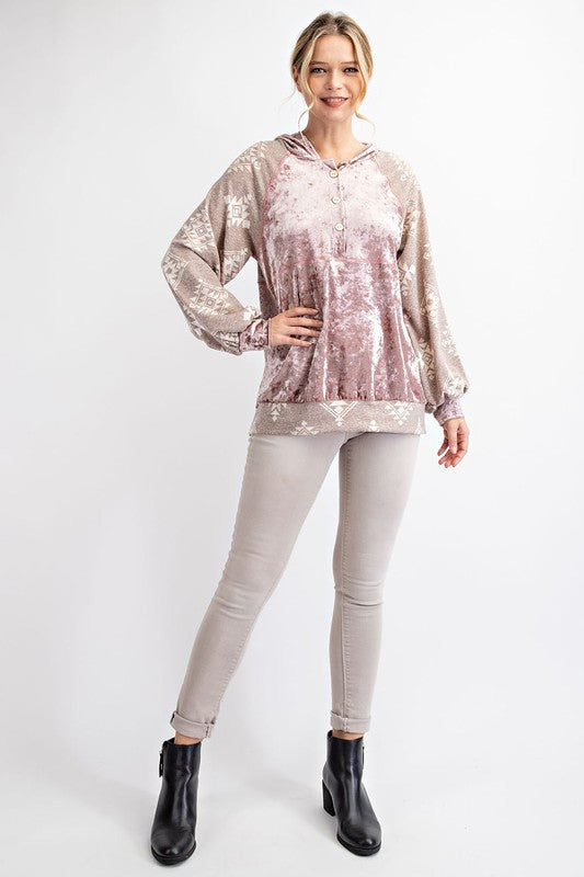 Mauve/Taupe Plus Size Velvet Tribal Contrast Hoodie