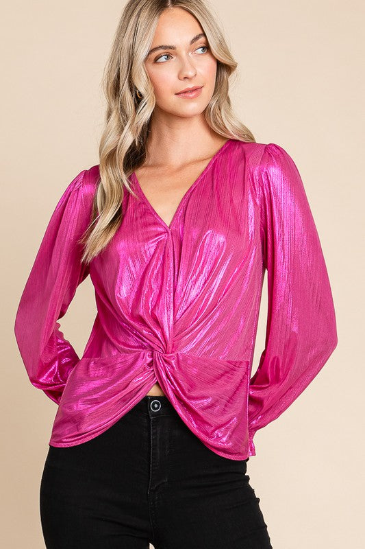 Fuchsia Metallic Fabric V Neck Long Sleeve Top
